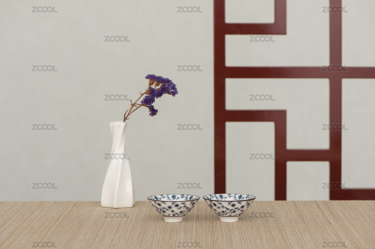 中国画风格,窗棂边的桌面上放着两个茶杯,边上是一枝干花插在花瓶里
