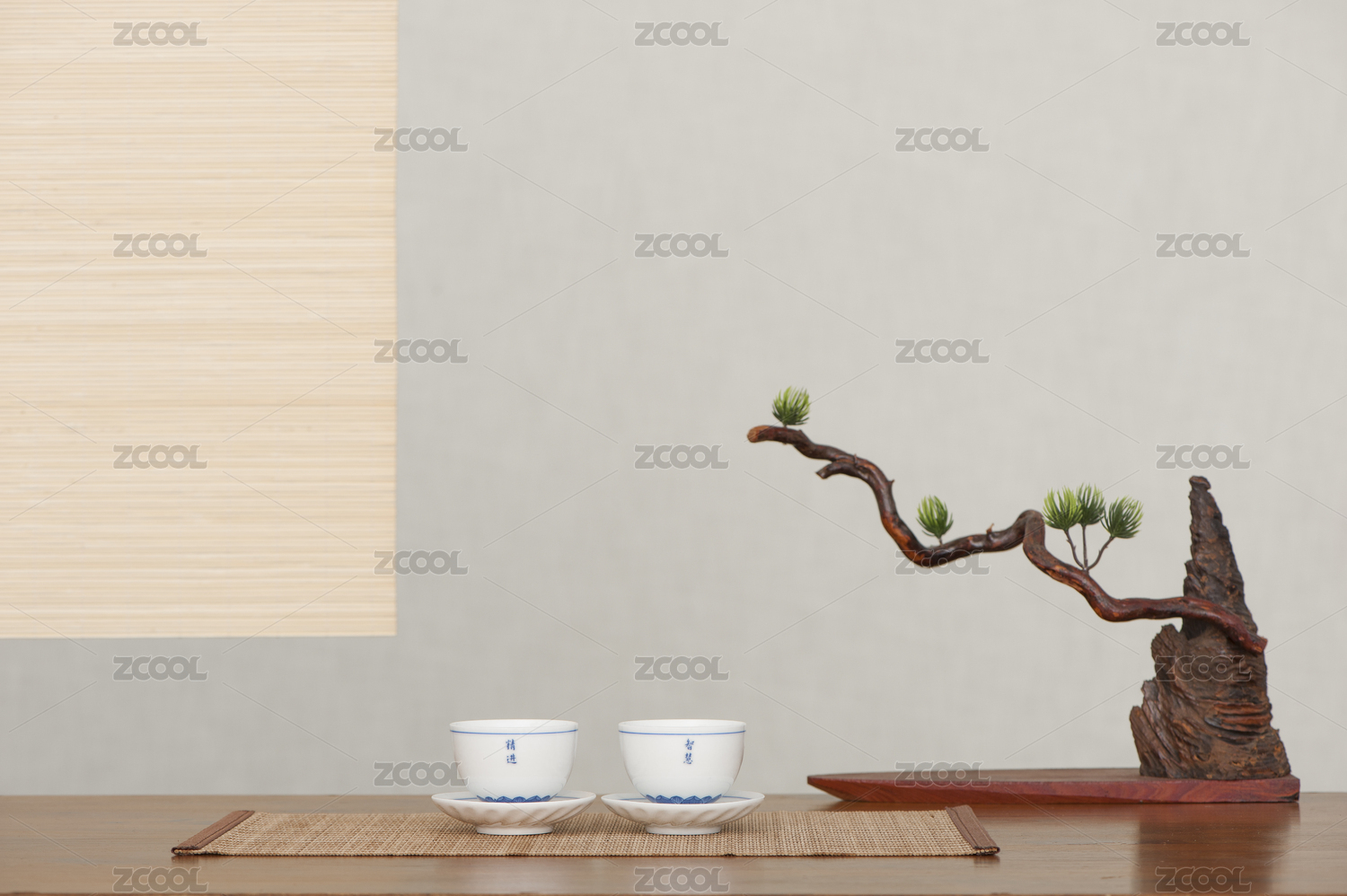 中国画风格,茶帘下面的桌面上放着两个茶杯,还有一件手工艺品