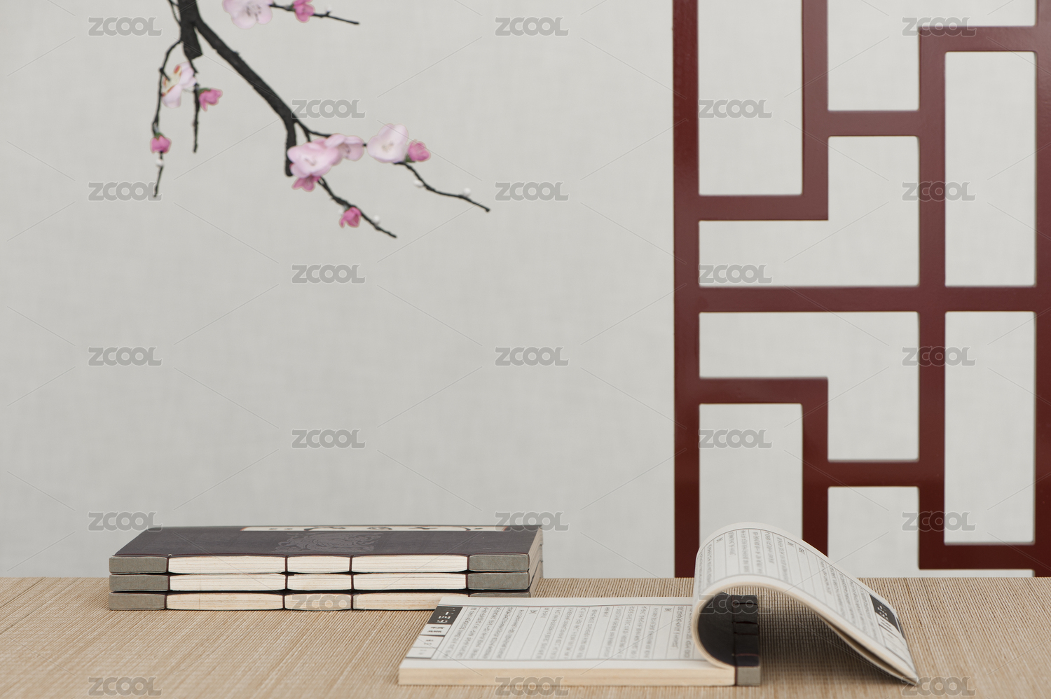 中国画风格,窗棂边的桌面上放着一摞线装书,边上是一枝梅花