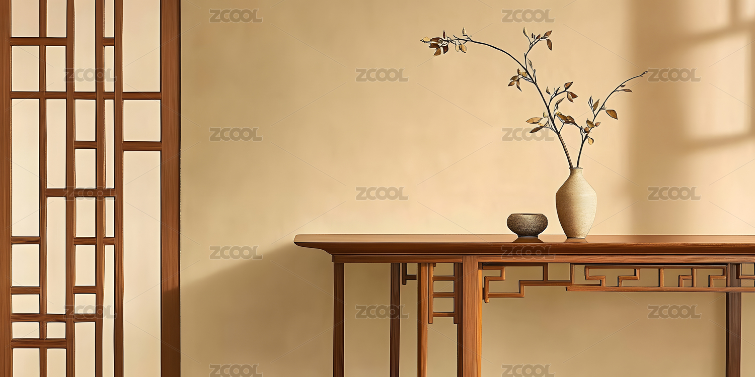 中国画风格,茶帘下面的桌面上放着一本线装书和一个茶杯,还有一件手工艺品