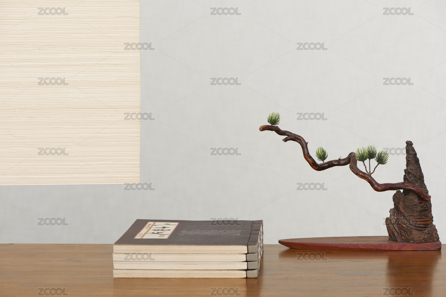 中国画风格,茶帘下面的桌面上放着一摞线装书和一个茶杯,还有一件手工艺品