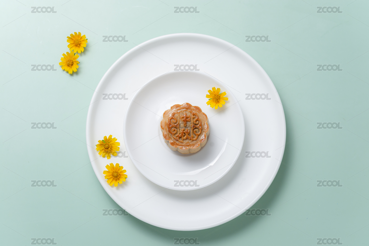 青色桌面上的中秋月饼和麦穗小雏菊