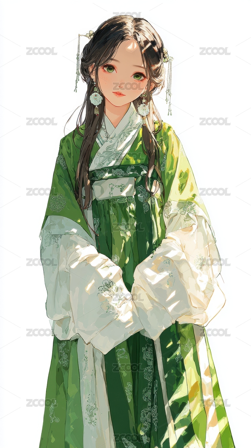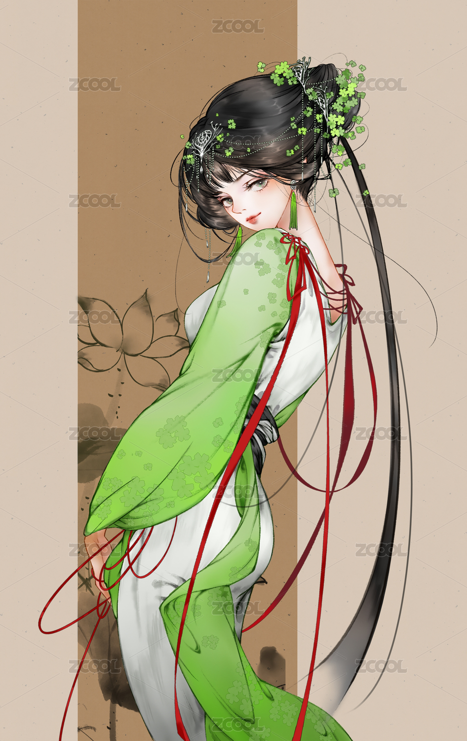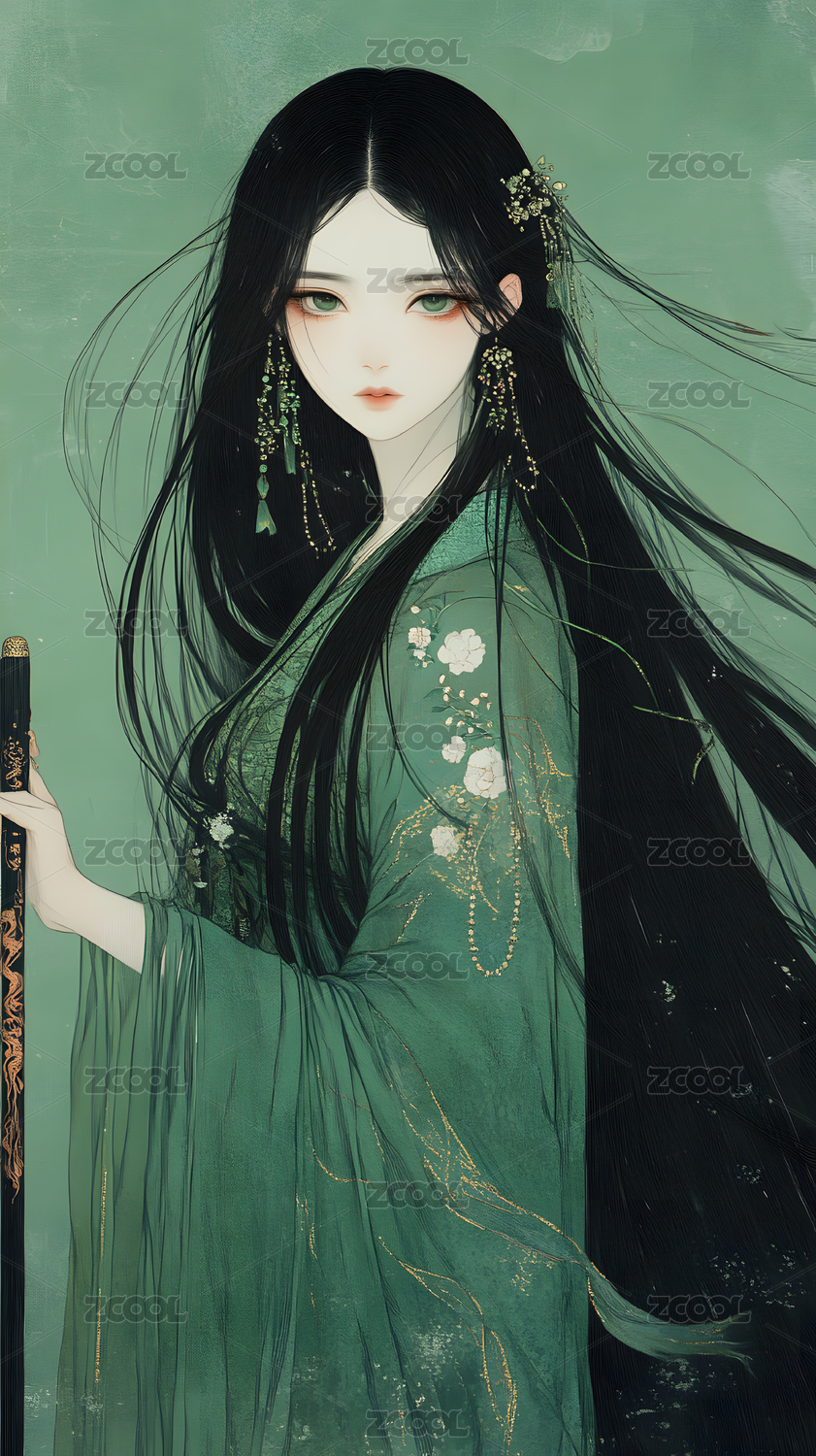 猫咪,拟人,古风,绿色,美女,可爱,水墨,水彩,封面,小说