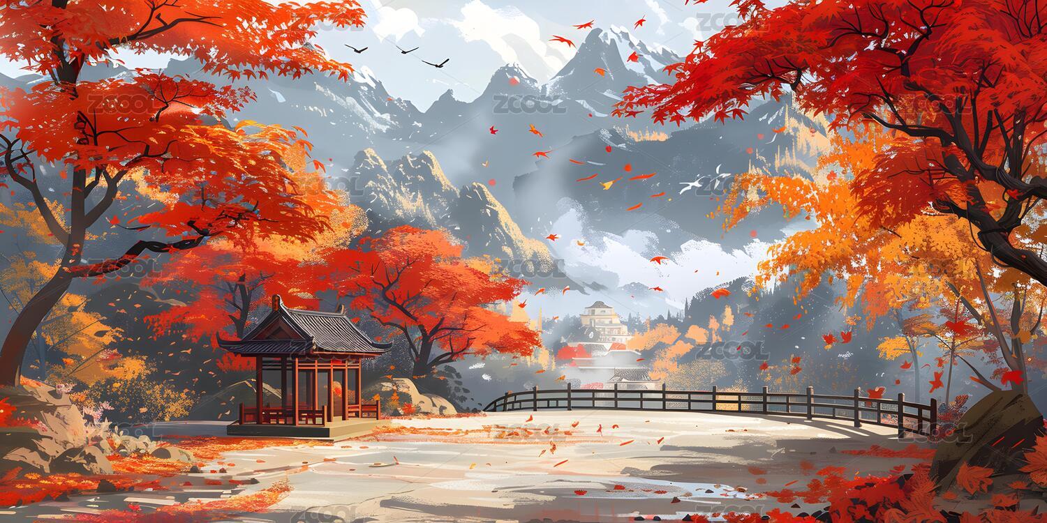 秋天红色枫树叶下中式凉亭建筑风景插画