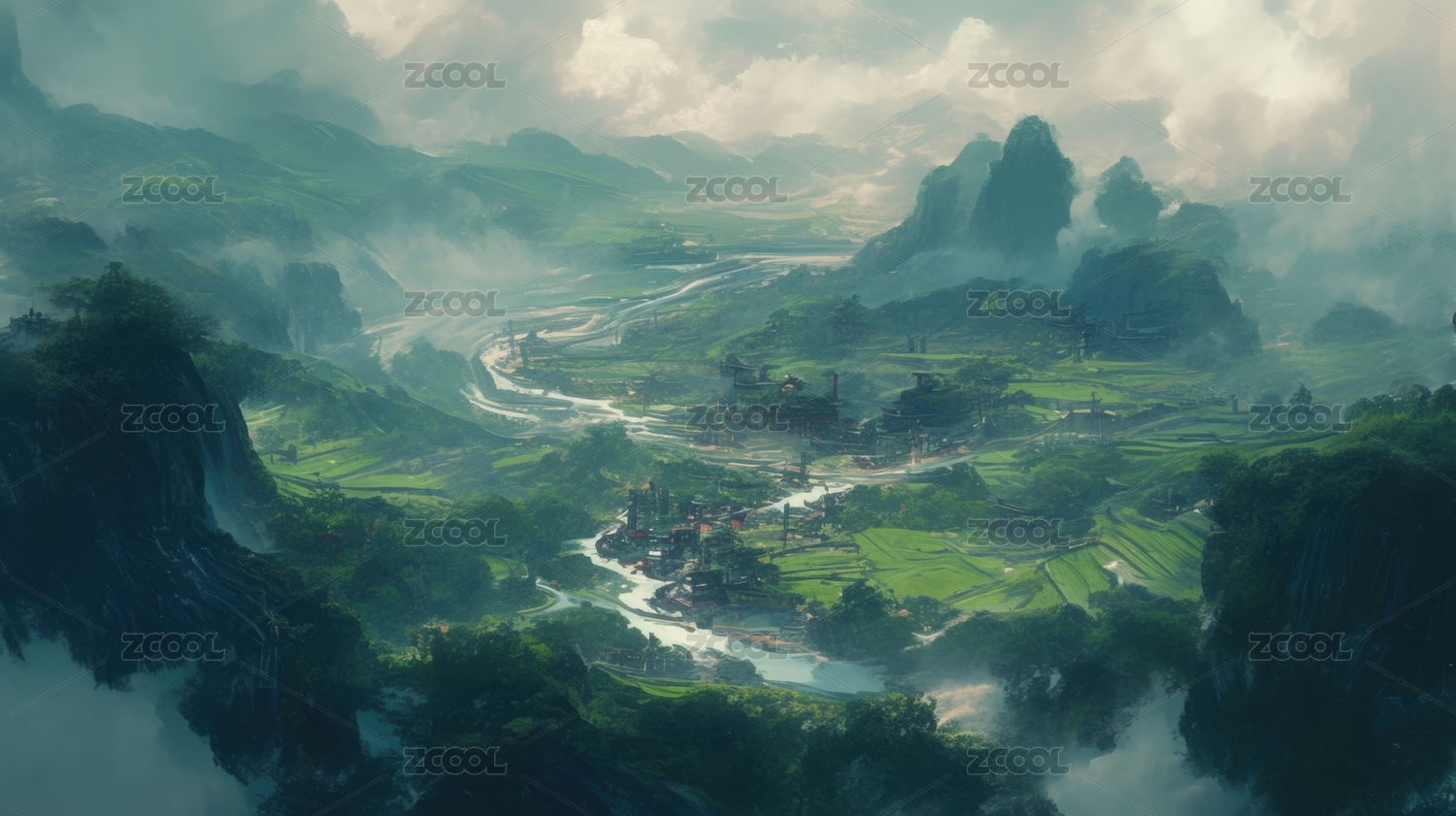 山清水秀的中国传统山水配以雾霭 诗情画意