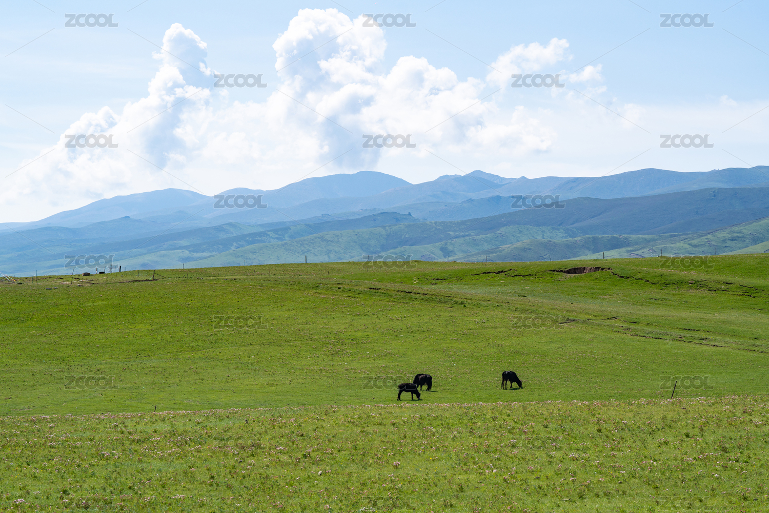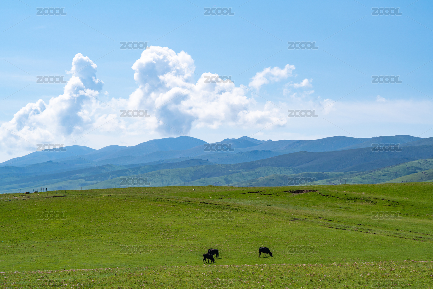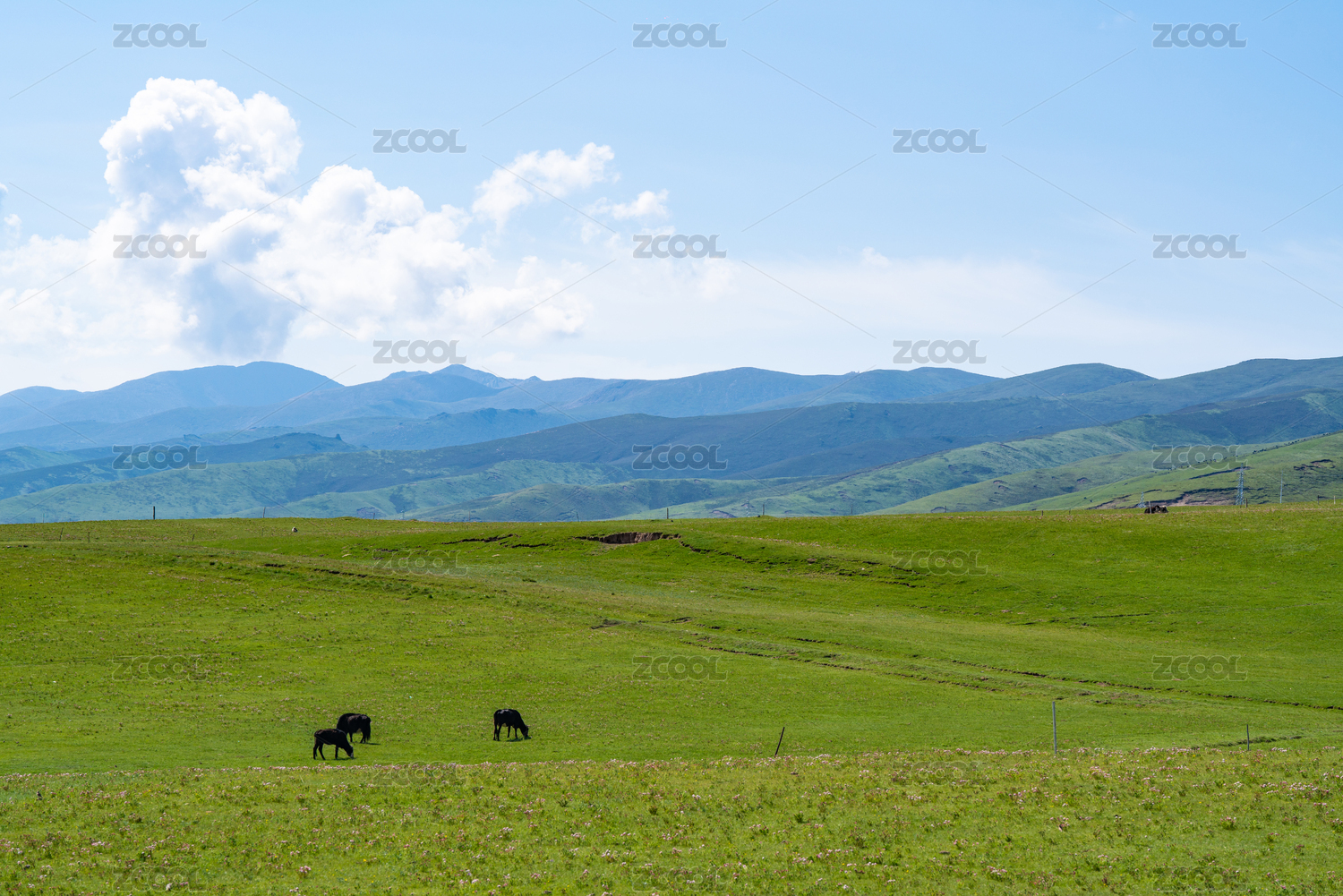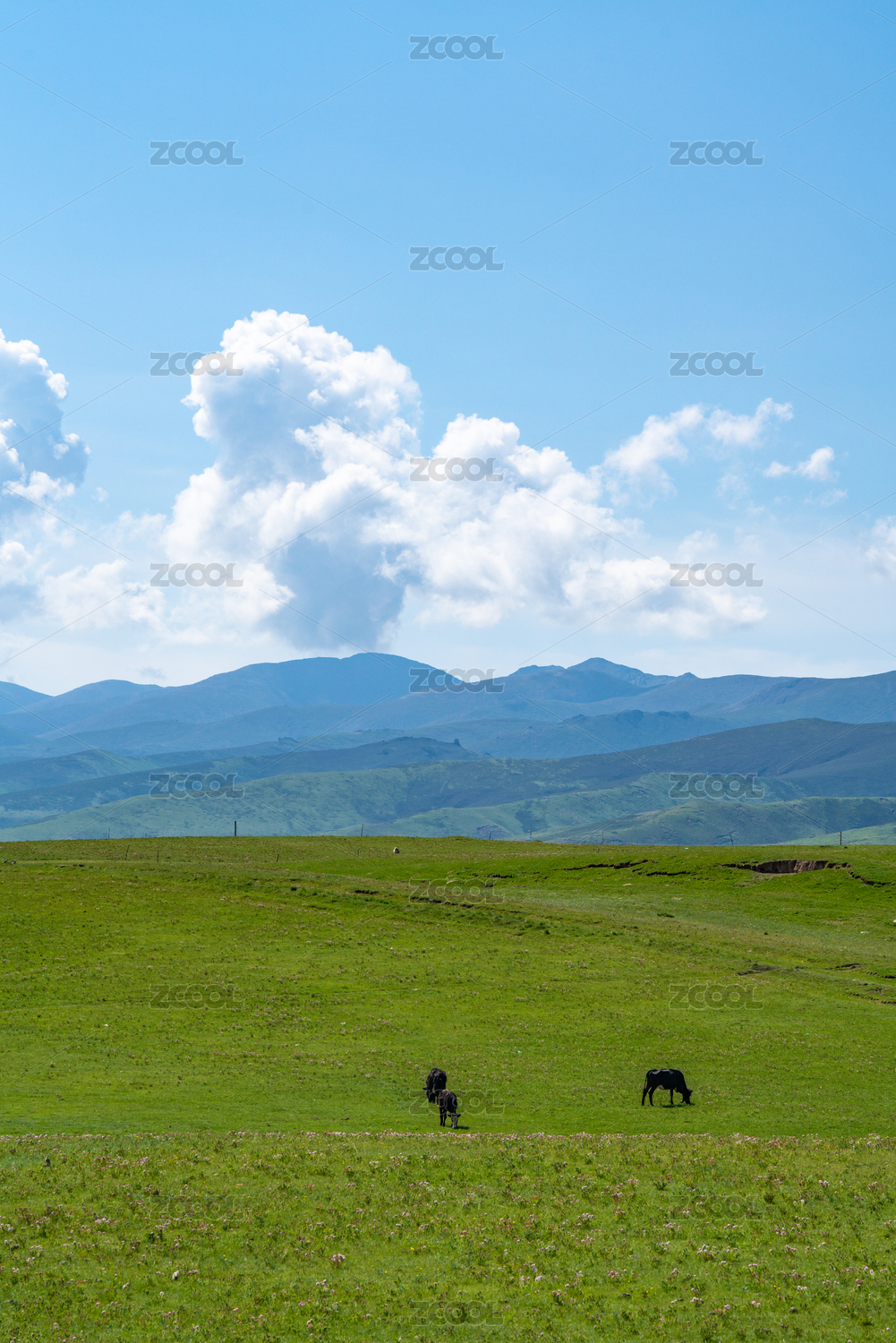 蓝天白云下的草原山脉和高原牧场,中国西藏