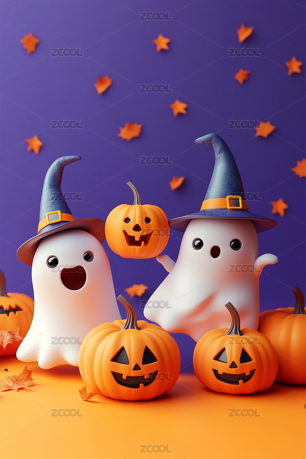 3D卡通可爱幽灵和南瓜落叶的万圣节背景