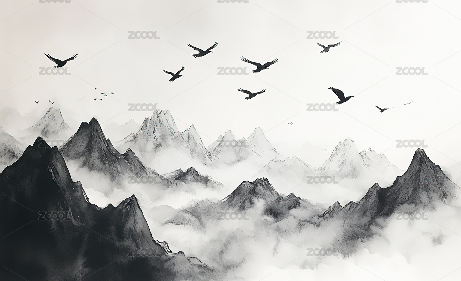 雾中山峦与飞鸟