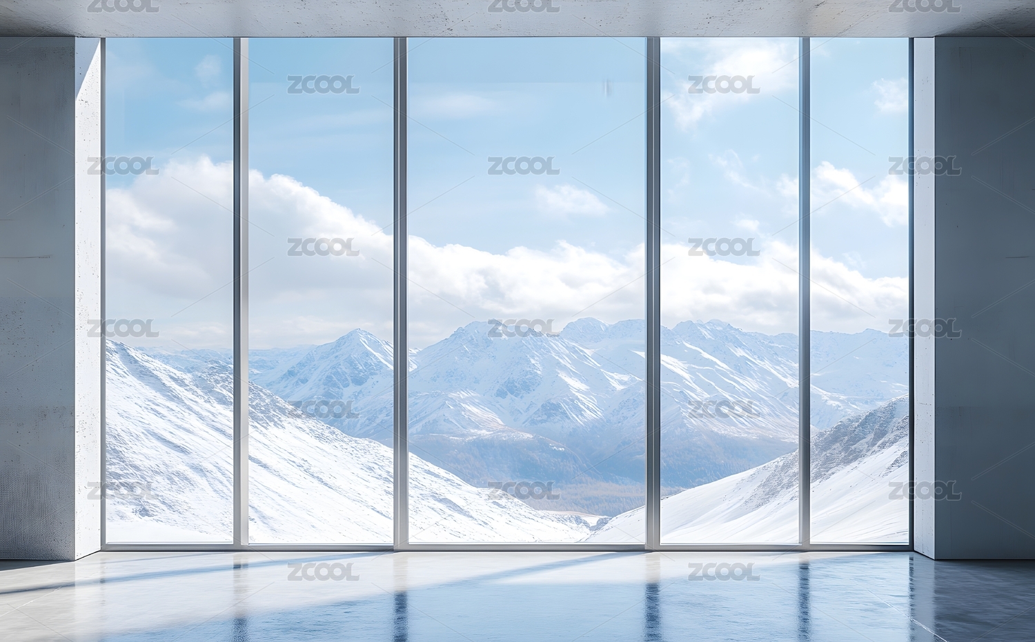 现代建筑内部落地窗和窗外的雪山