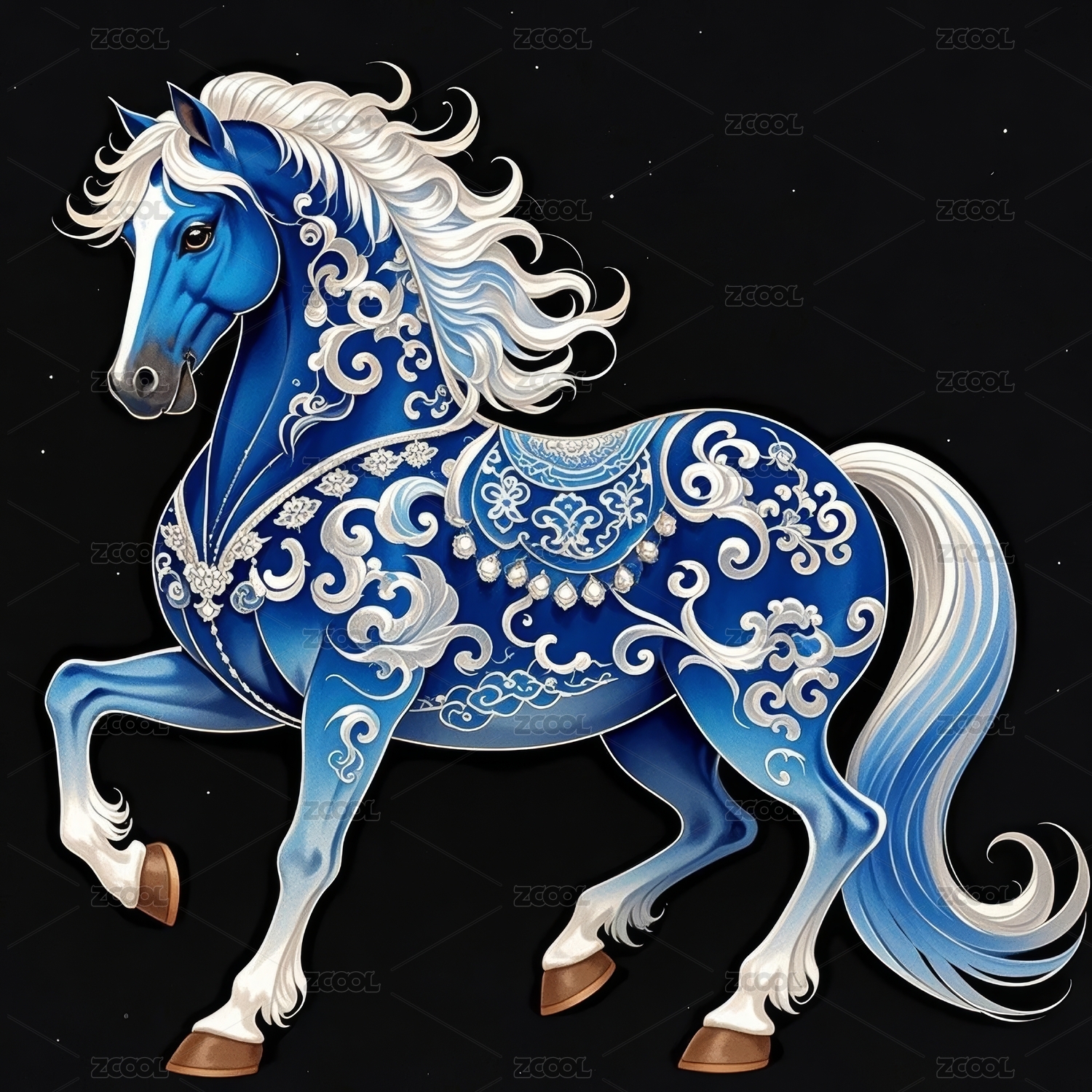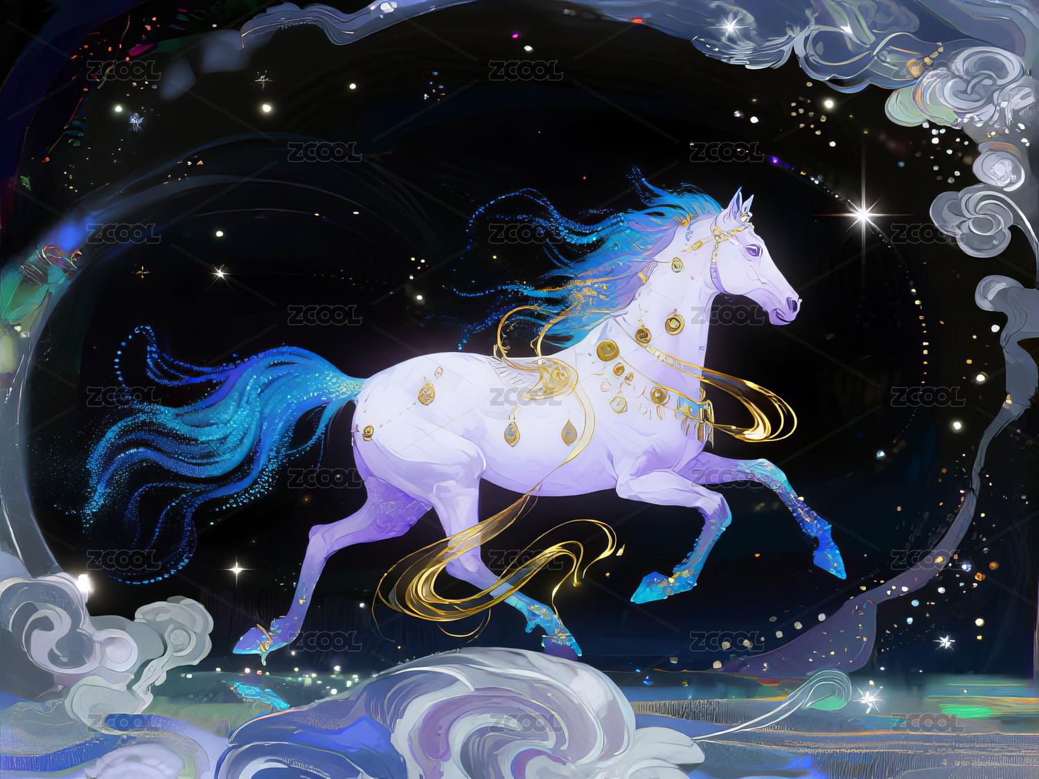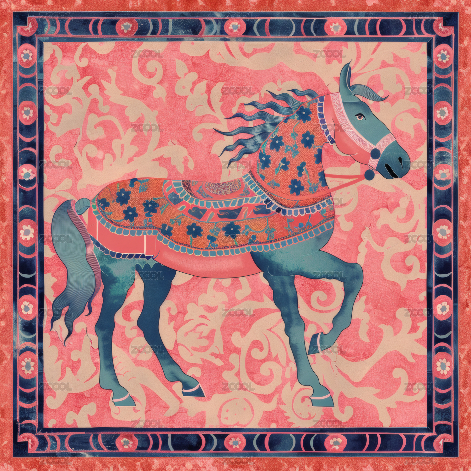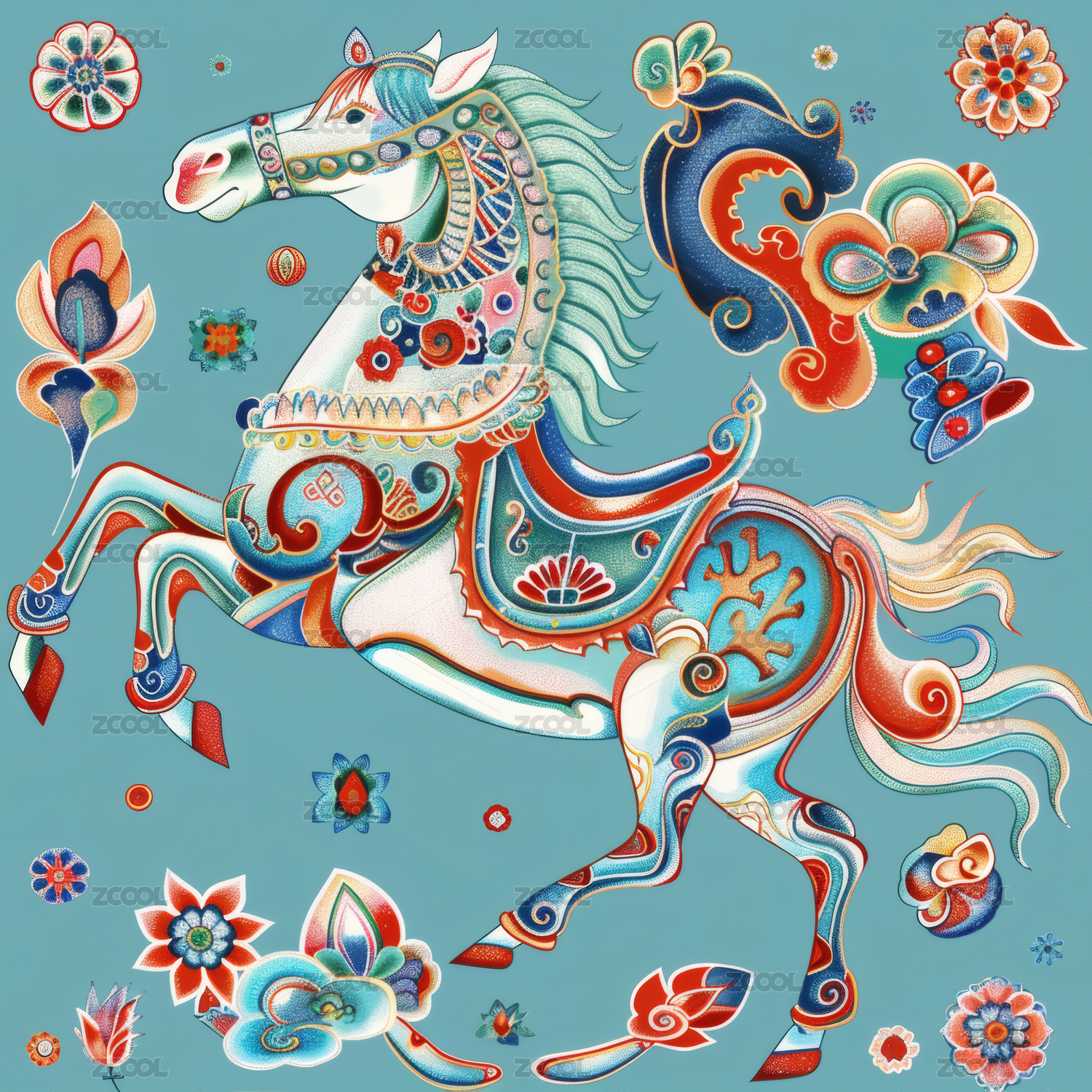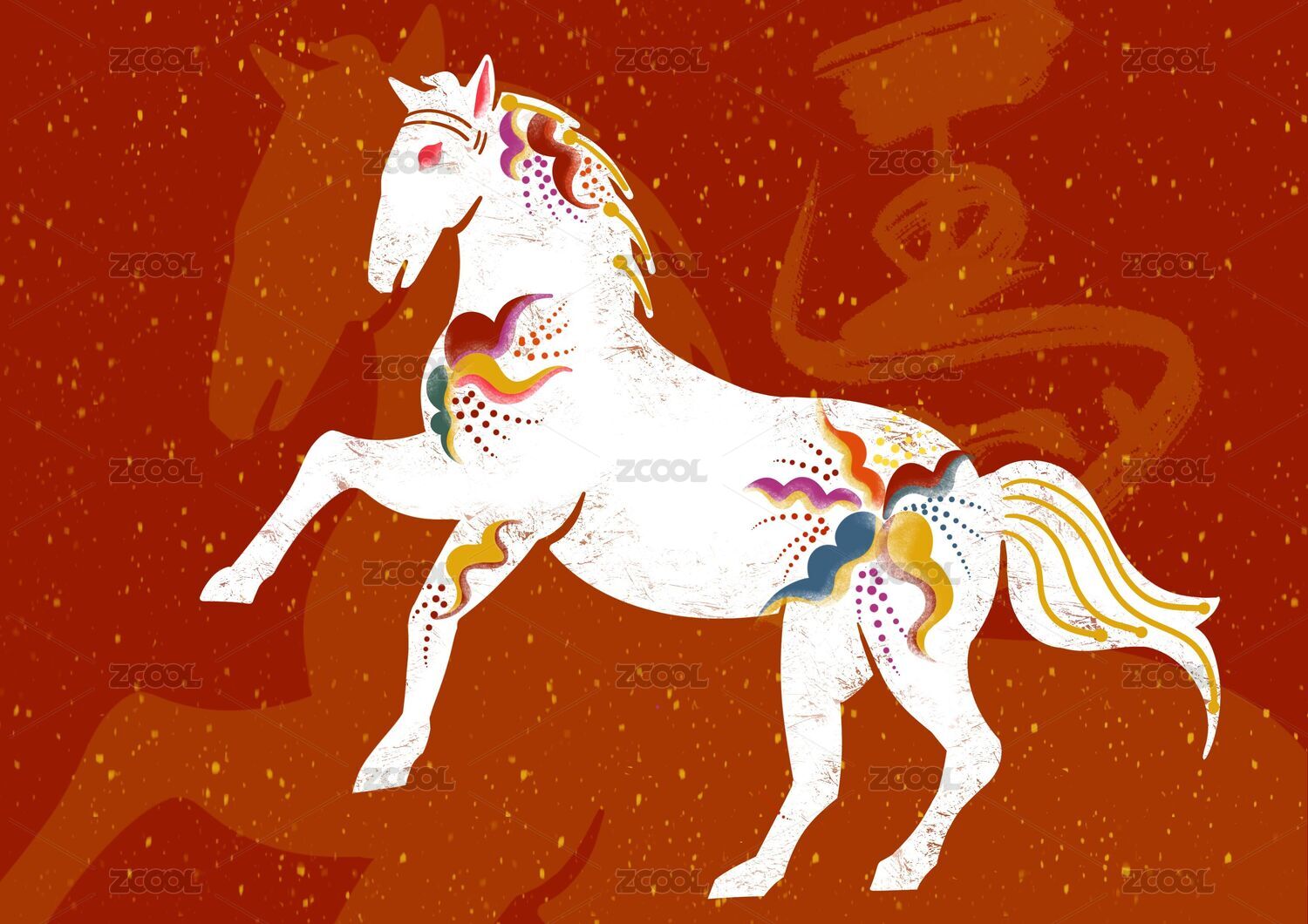 国潮风,敦煌,十二生肖,动物,红色,生肖,飞天,午马,插画
