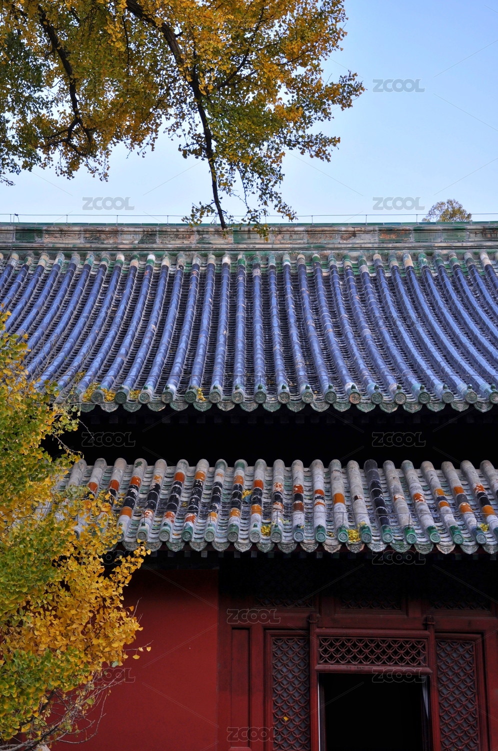 中国北京秋天银杏掩映下的宫墙屋檐