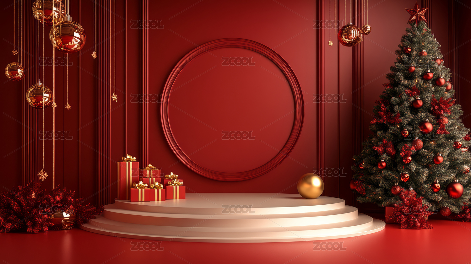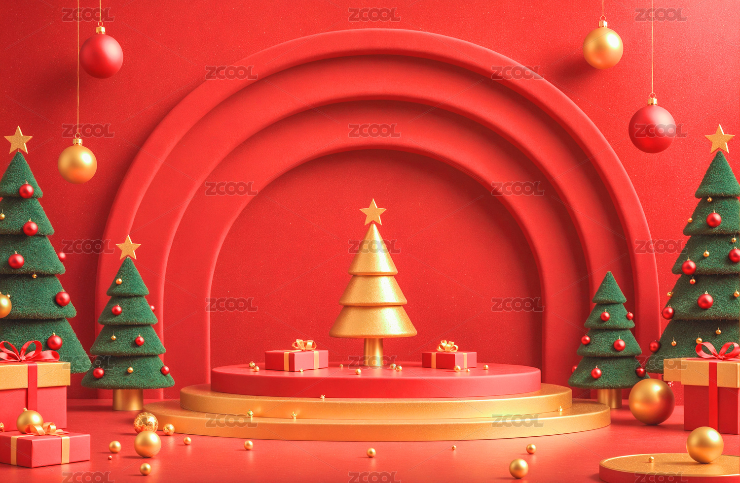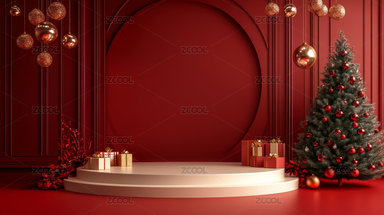 3D渲染红色圣诞节主题电商产品展台背景
