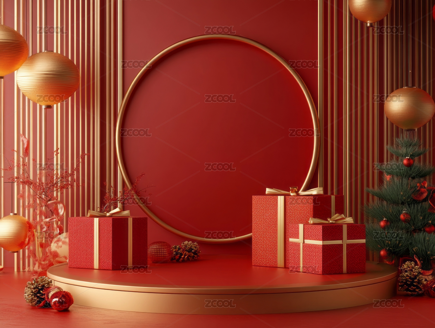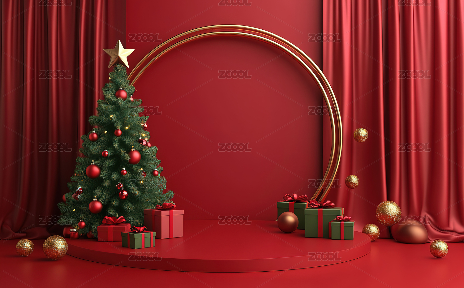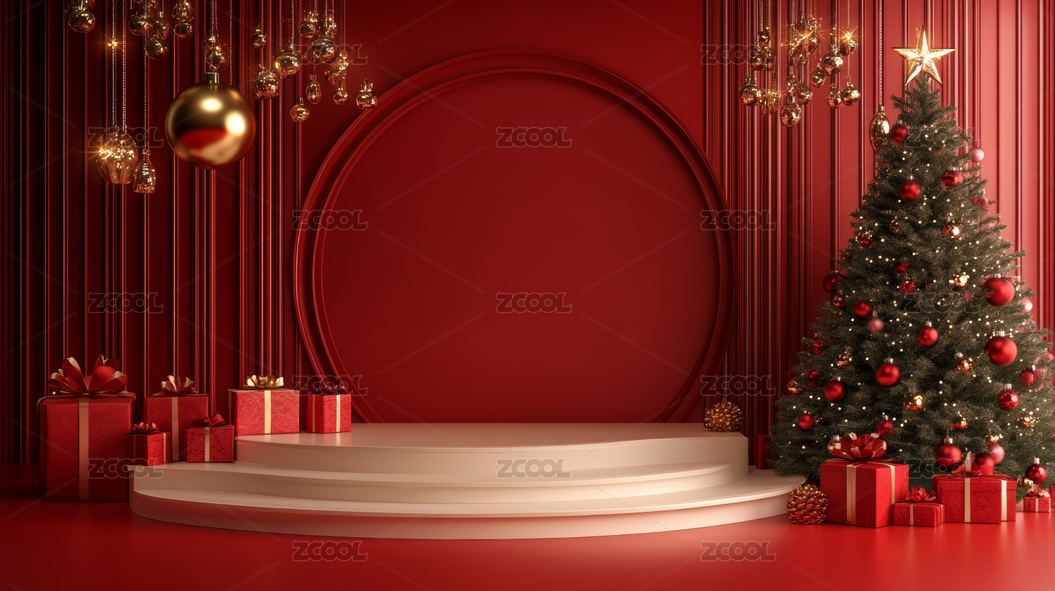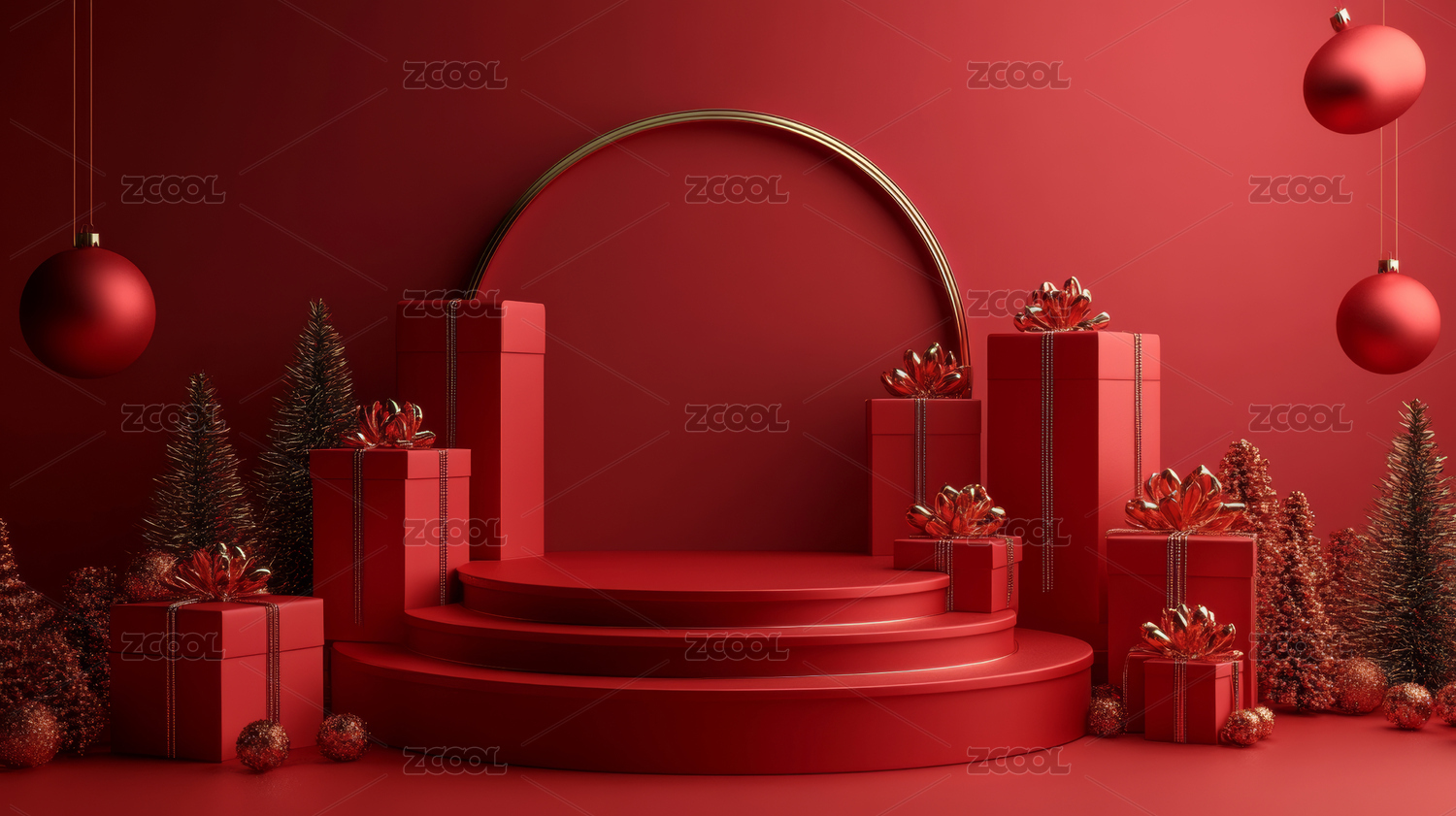 3D渲染红色圣诞节主题电商产品展台背景