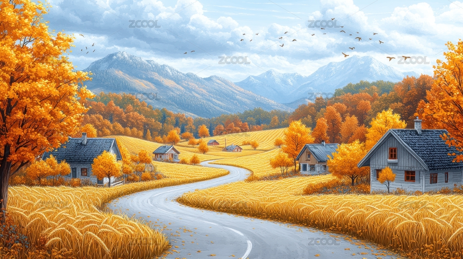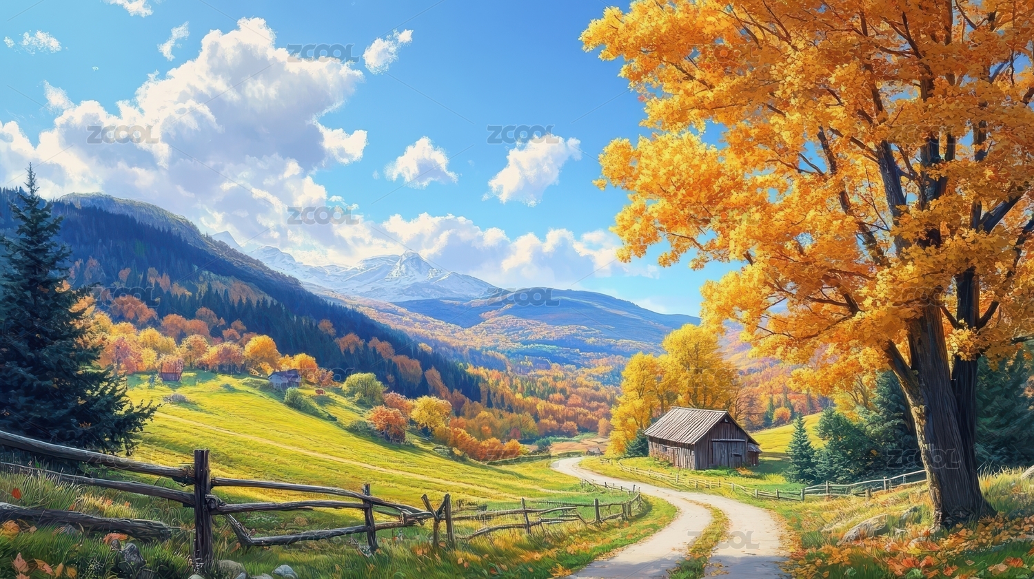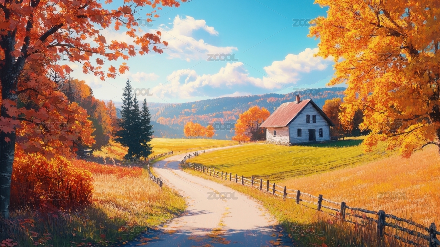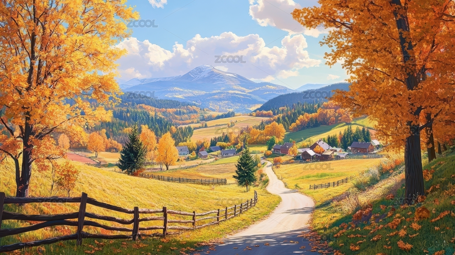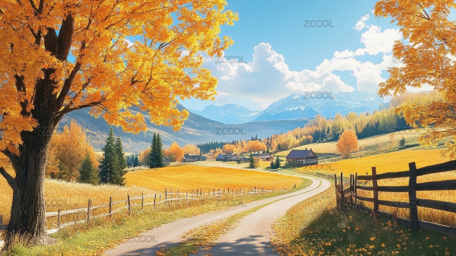 秋景,田园,乡村,树林,枫叶,红叶,秋色,金秋,田野,道路