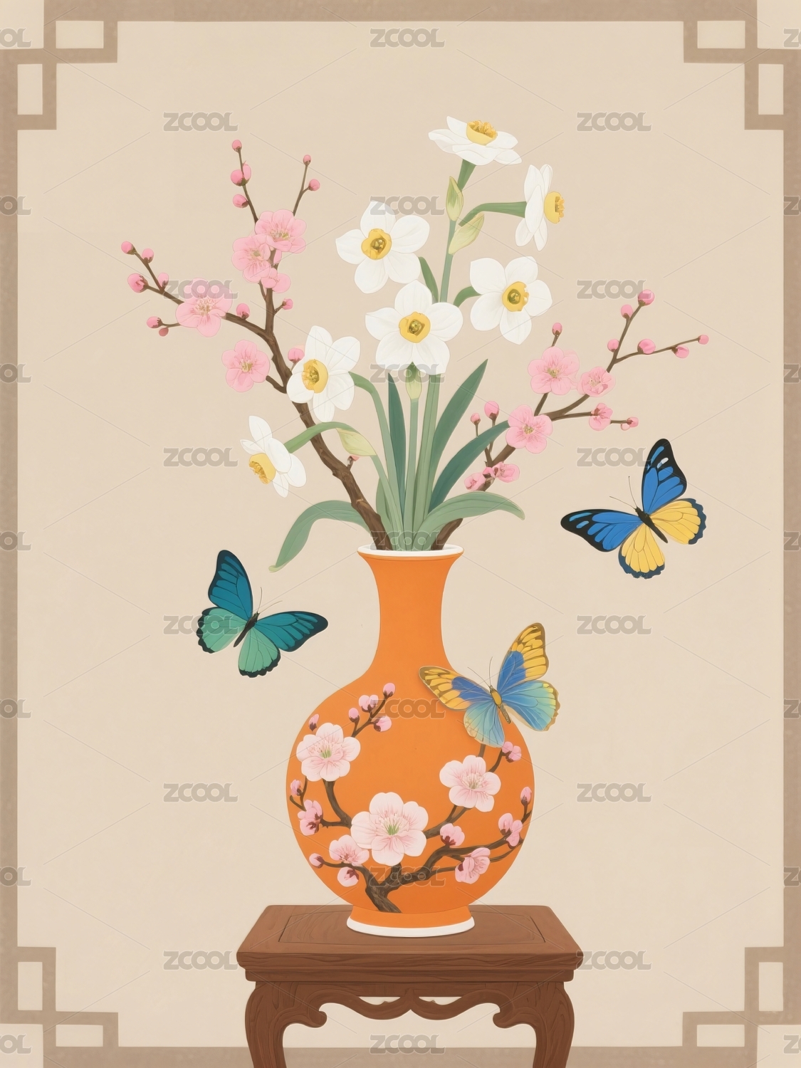 中国风中式复古木桌蝴蝶兰国画工笔画