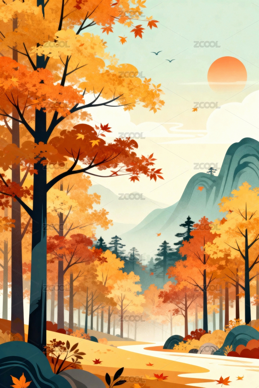 秋天扁平插画暖色树林落叶