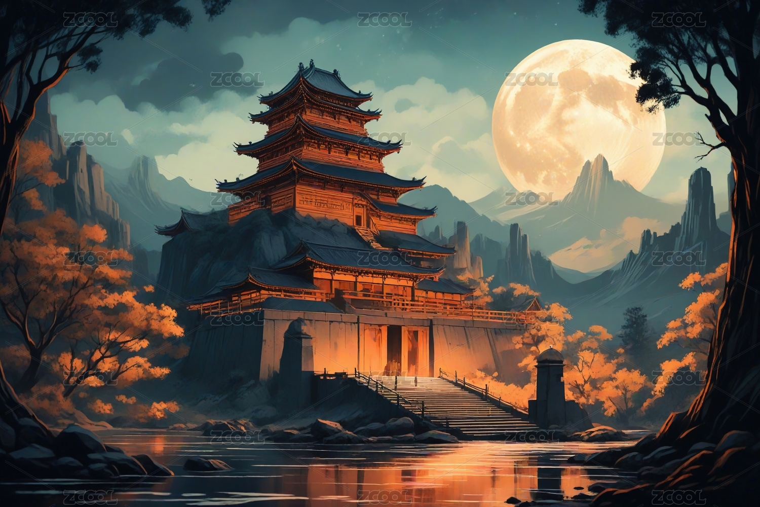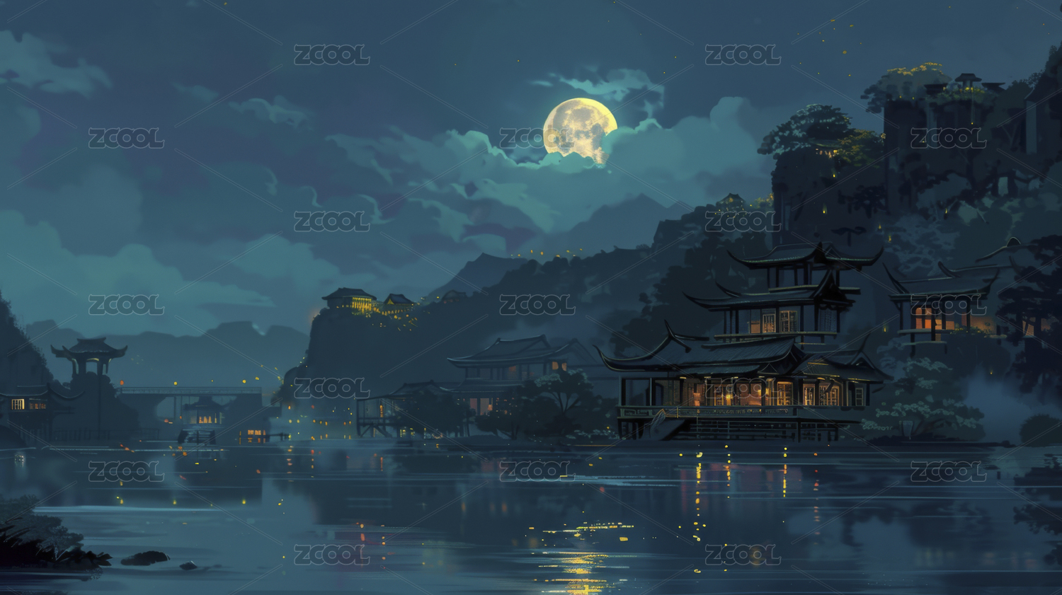AIGCFG,中式,中国风,国潮风,插画,卡通,月亮,中秋节,山,建筑