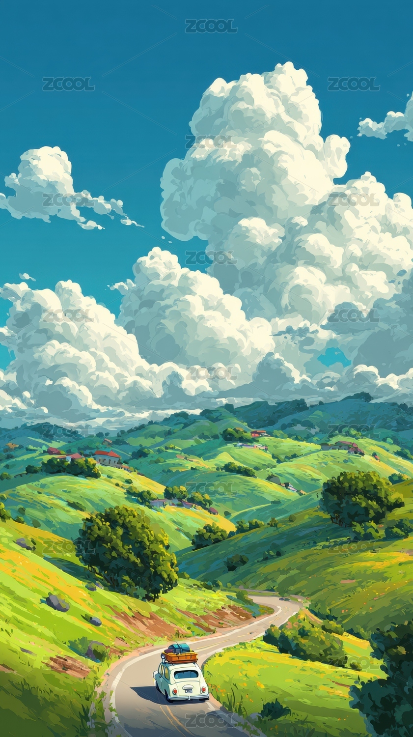 AIGCFG02,春天,草地,天空,风景,汽车,车,公路,卡通,插画