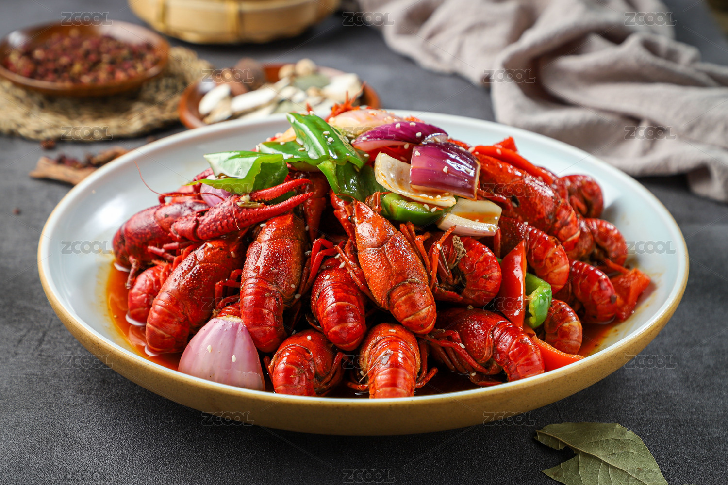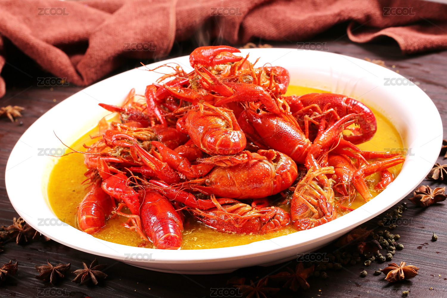 白布上装在盘子里的油焖藤椒小龙虾