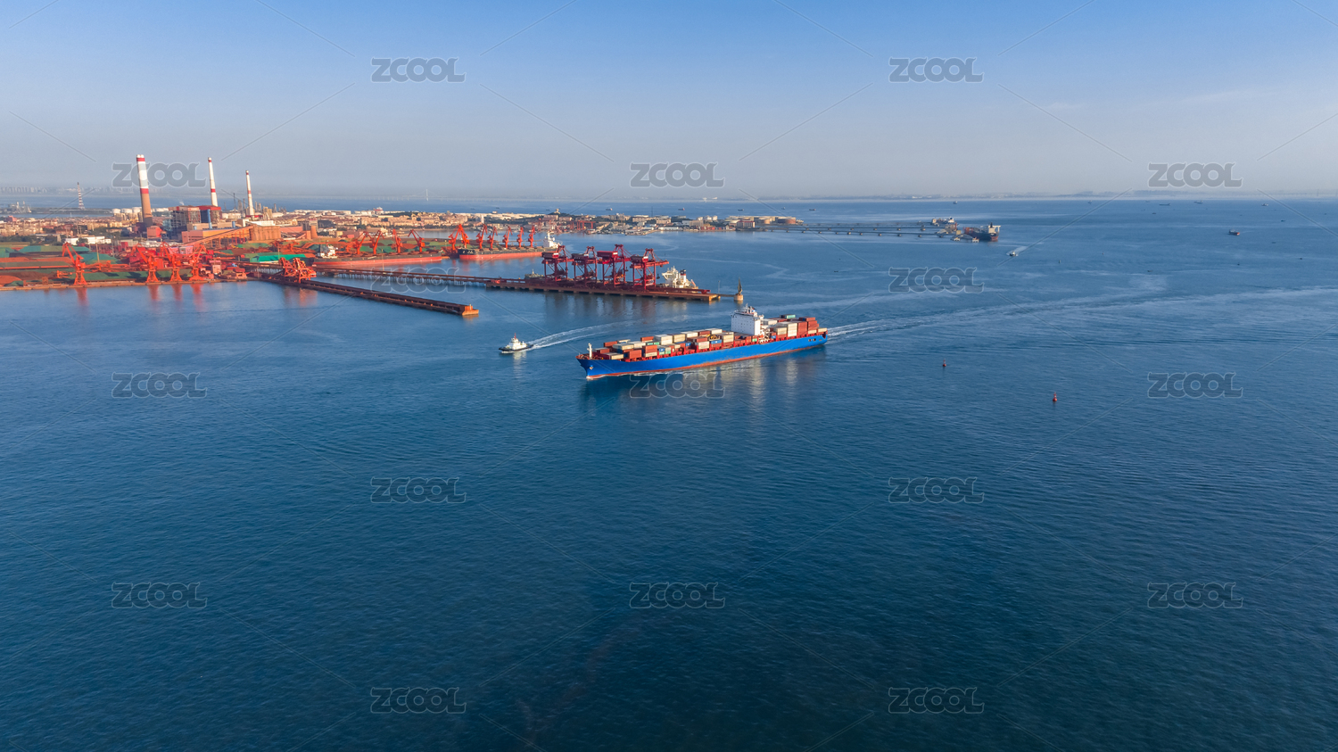 航拍天津港船舶进港