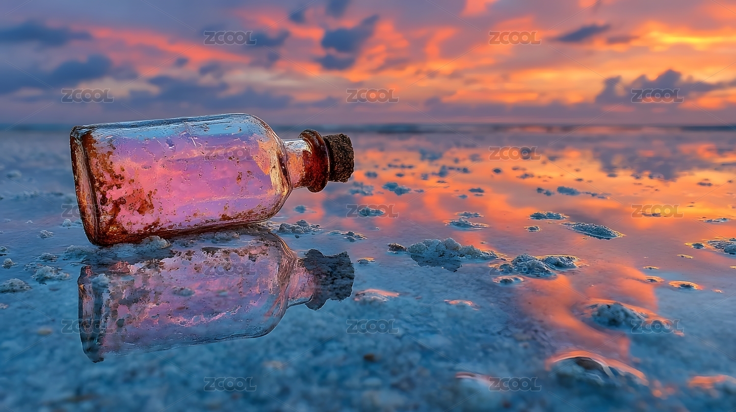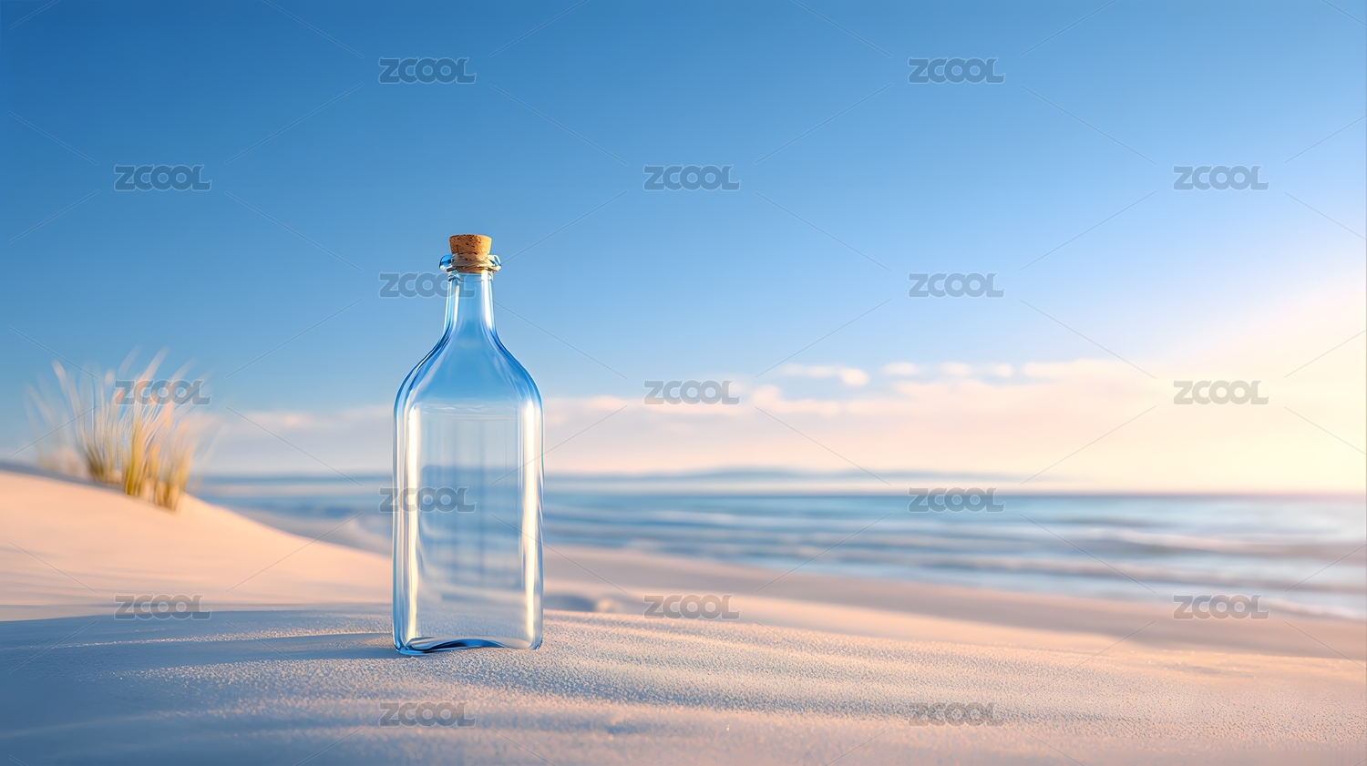 海边沙滩上的漂流瓶闪闪发亮瓶
