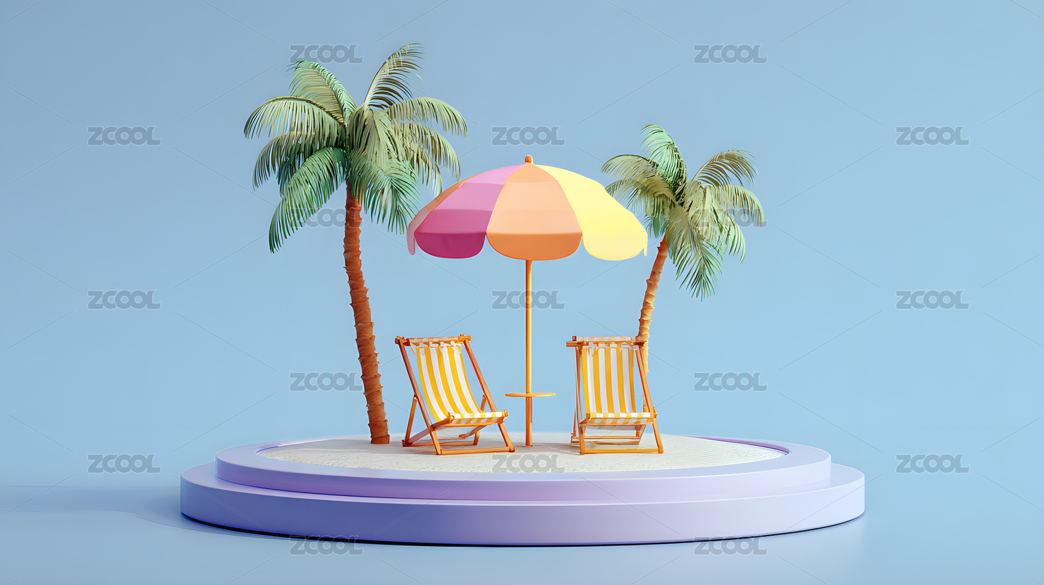 白色背景下的棕榈树和沙滩上的阳伞的高角度