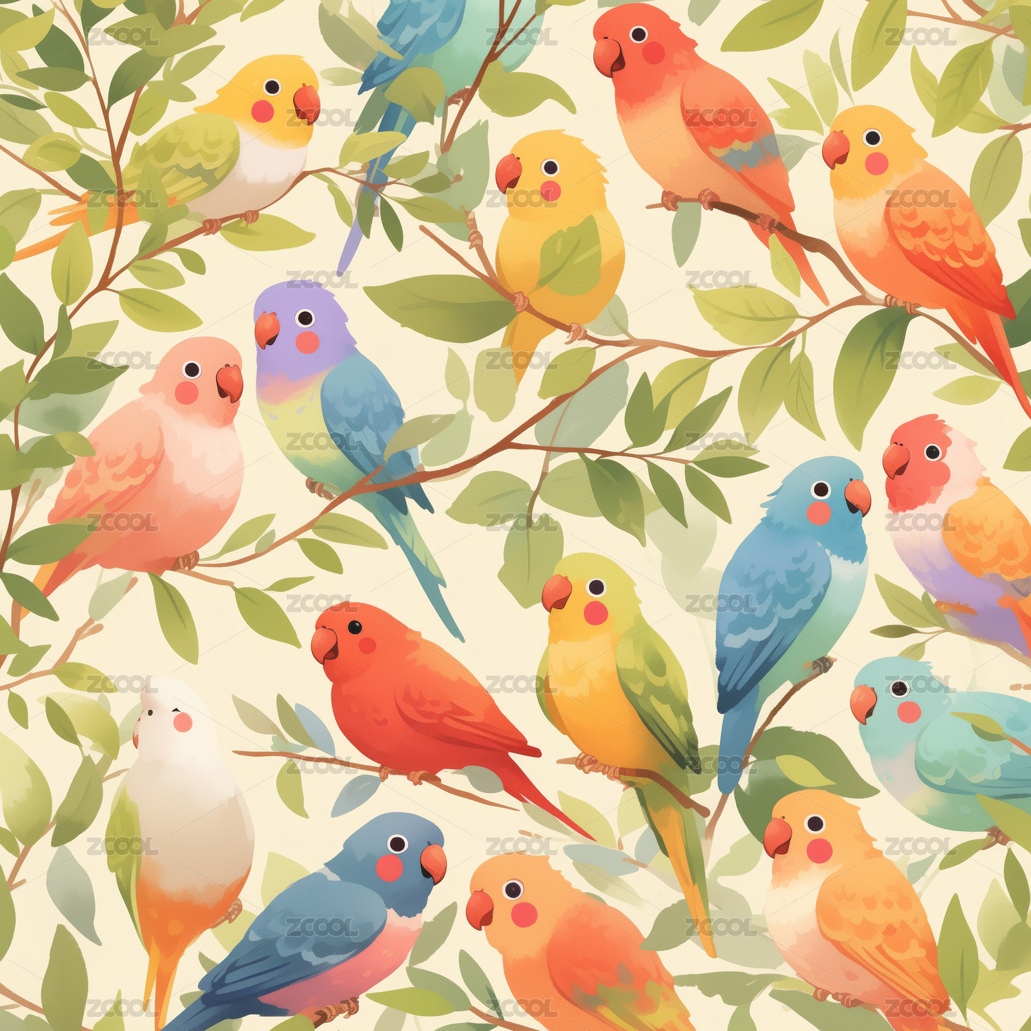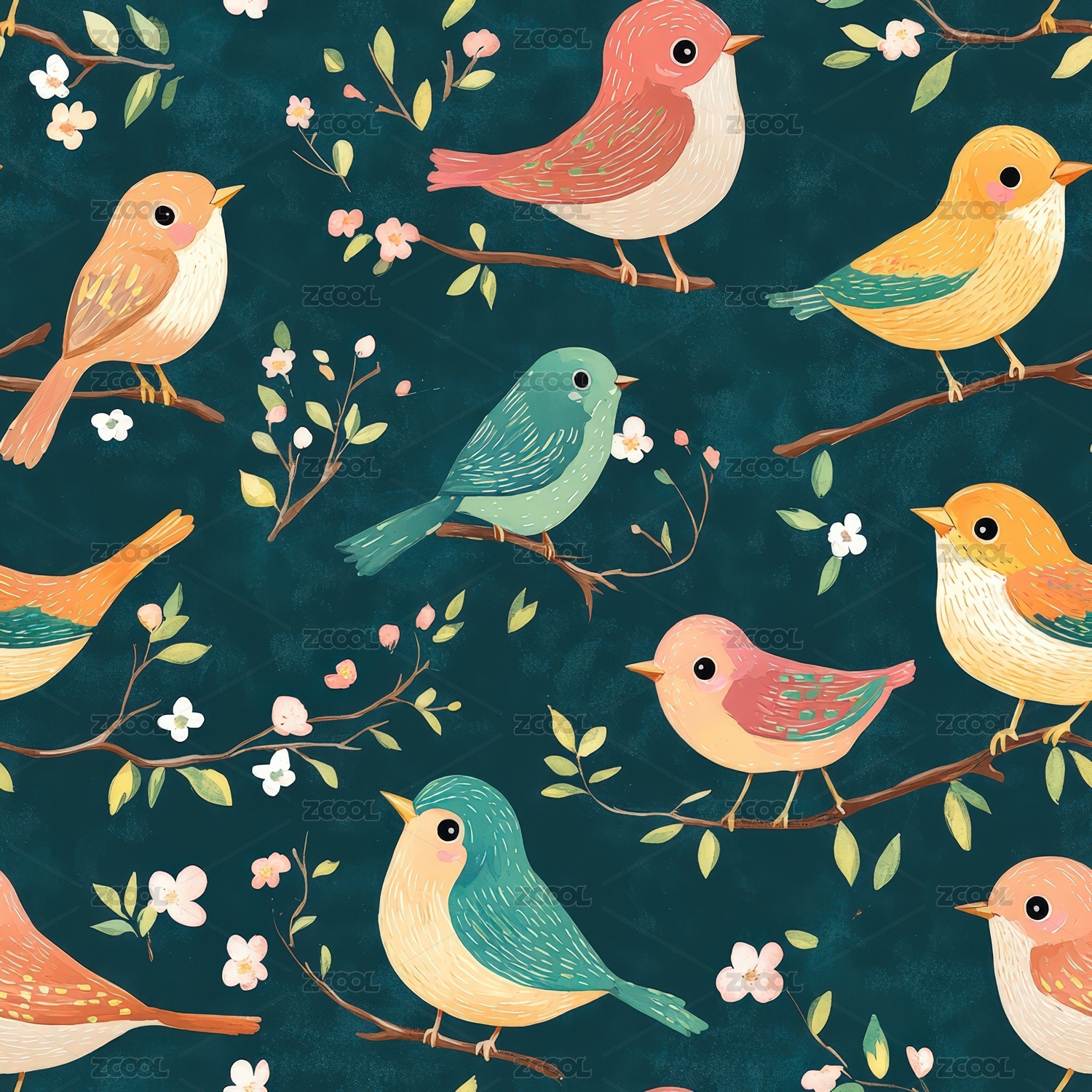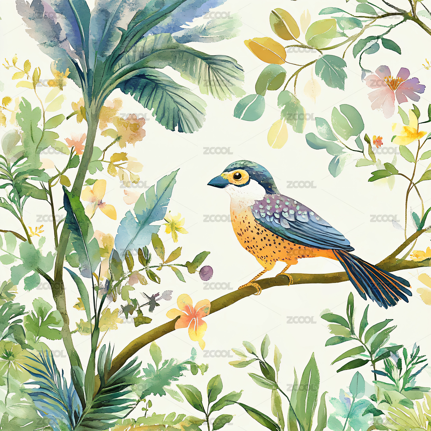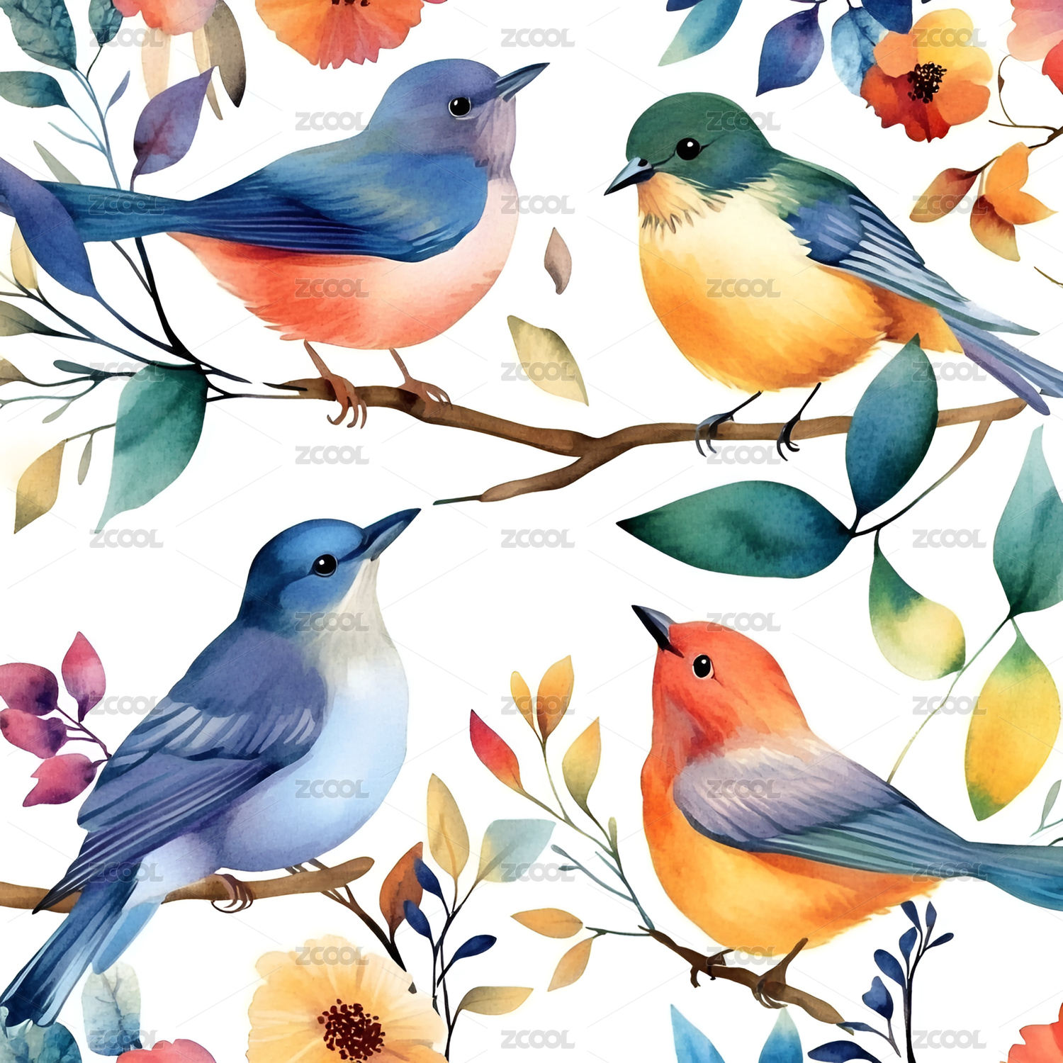 鸟类,画眉鸟,树枝,叶子,印花,水彩,风格,图案,壁纸,潮流