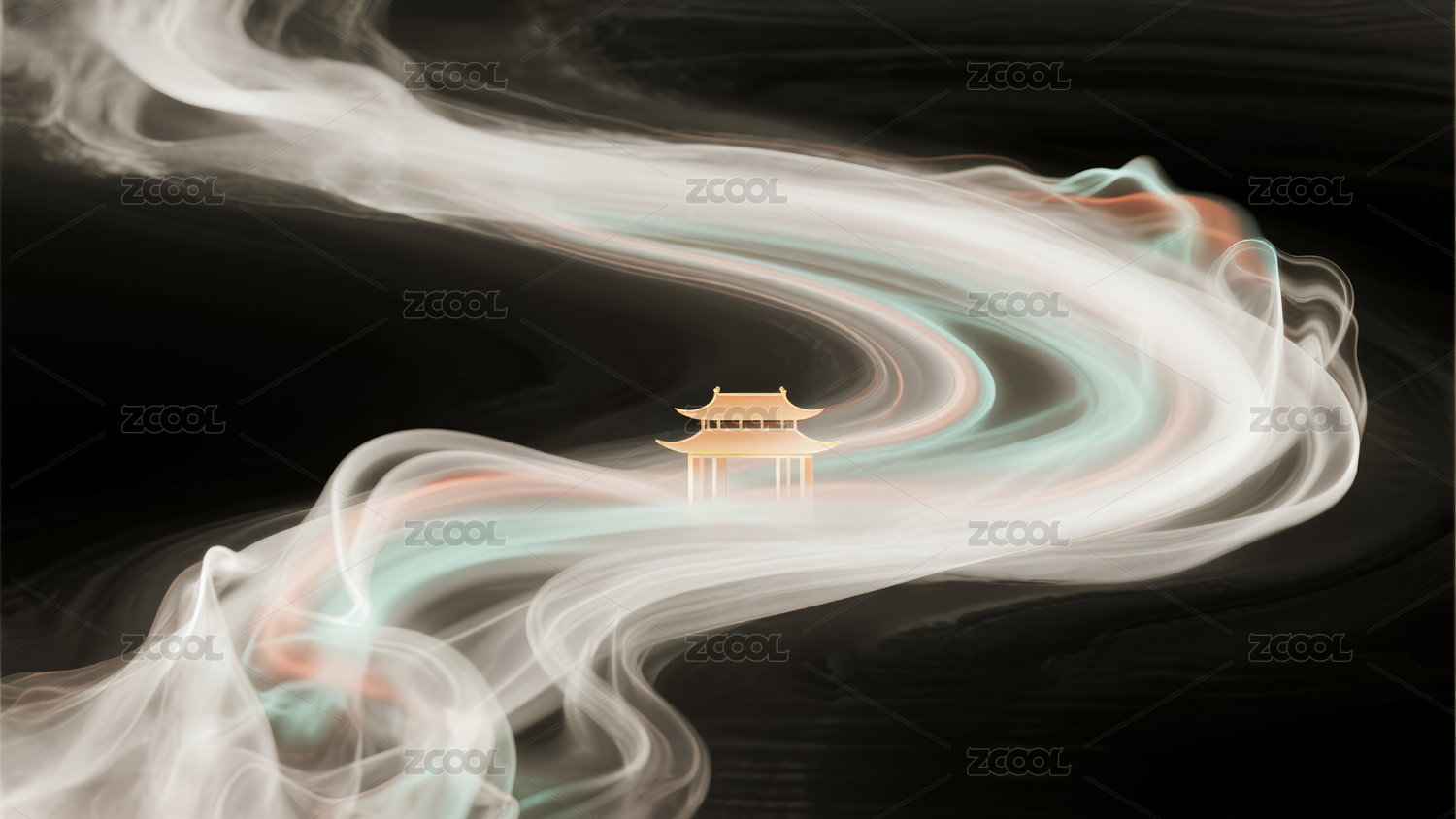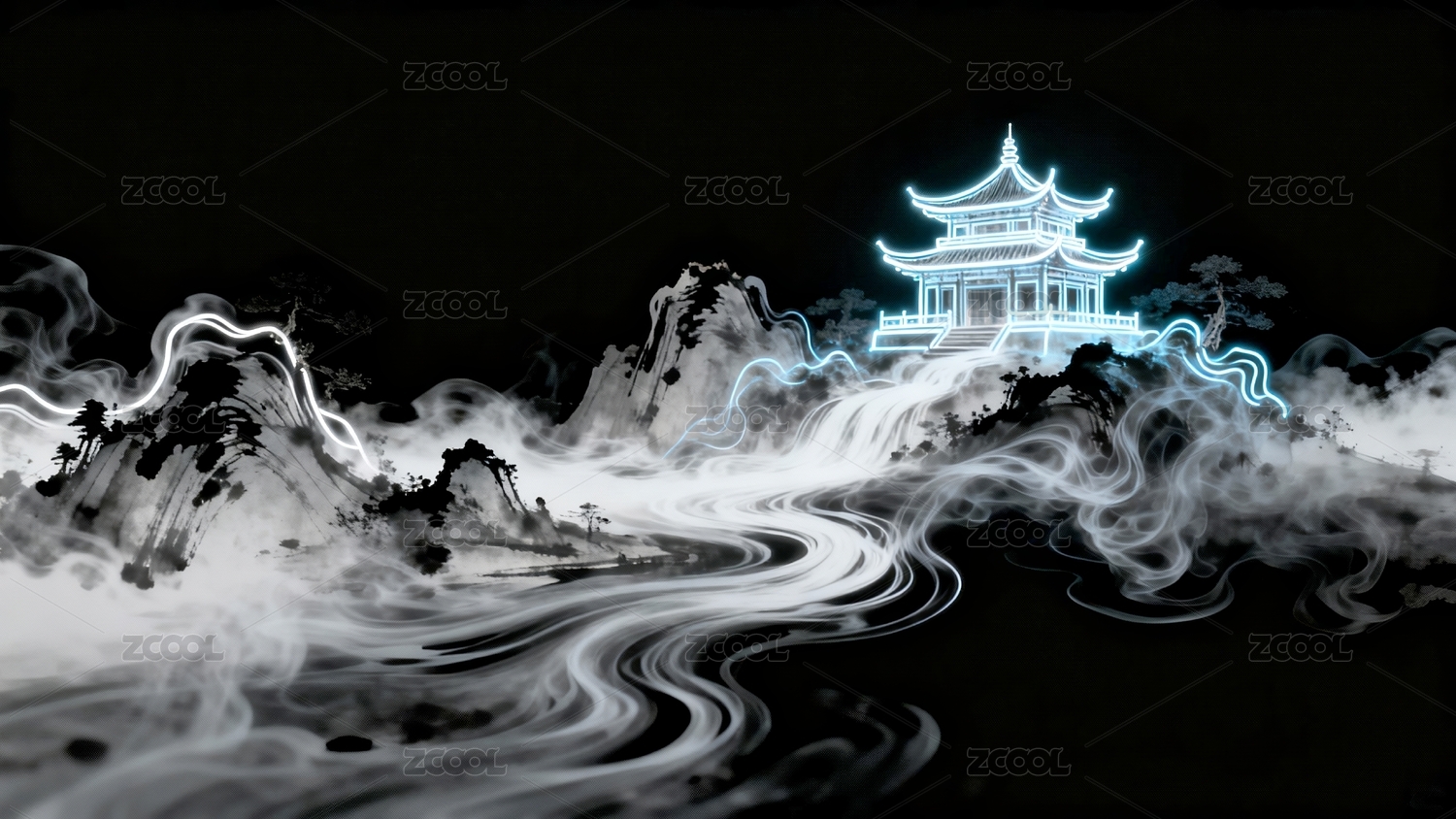 中国风云雾缭绕意境深远的沙画质感水墨山水
