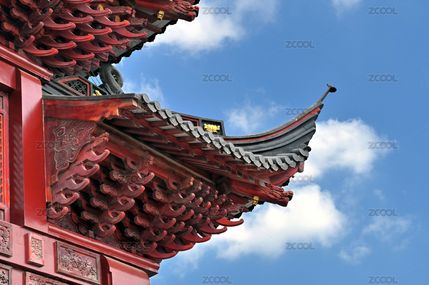 中国寺庙建筑屋角飞檐造型仰拍特写