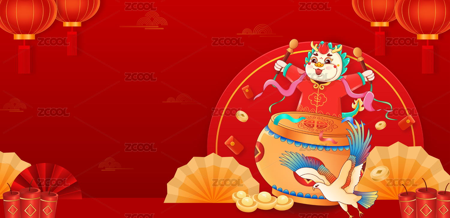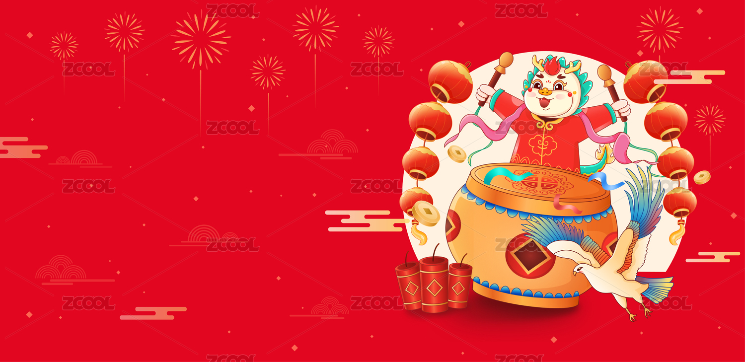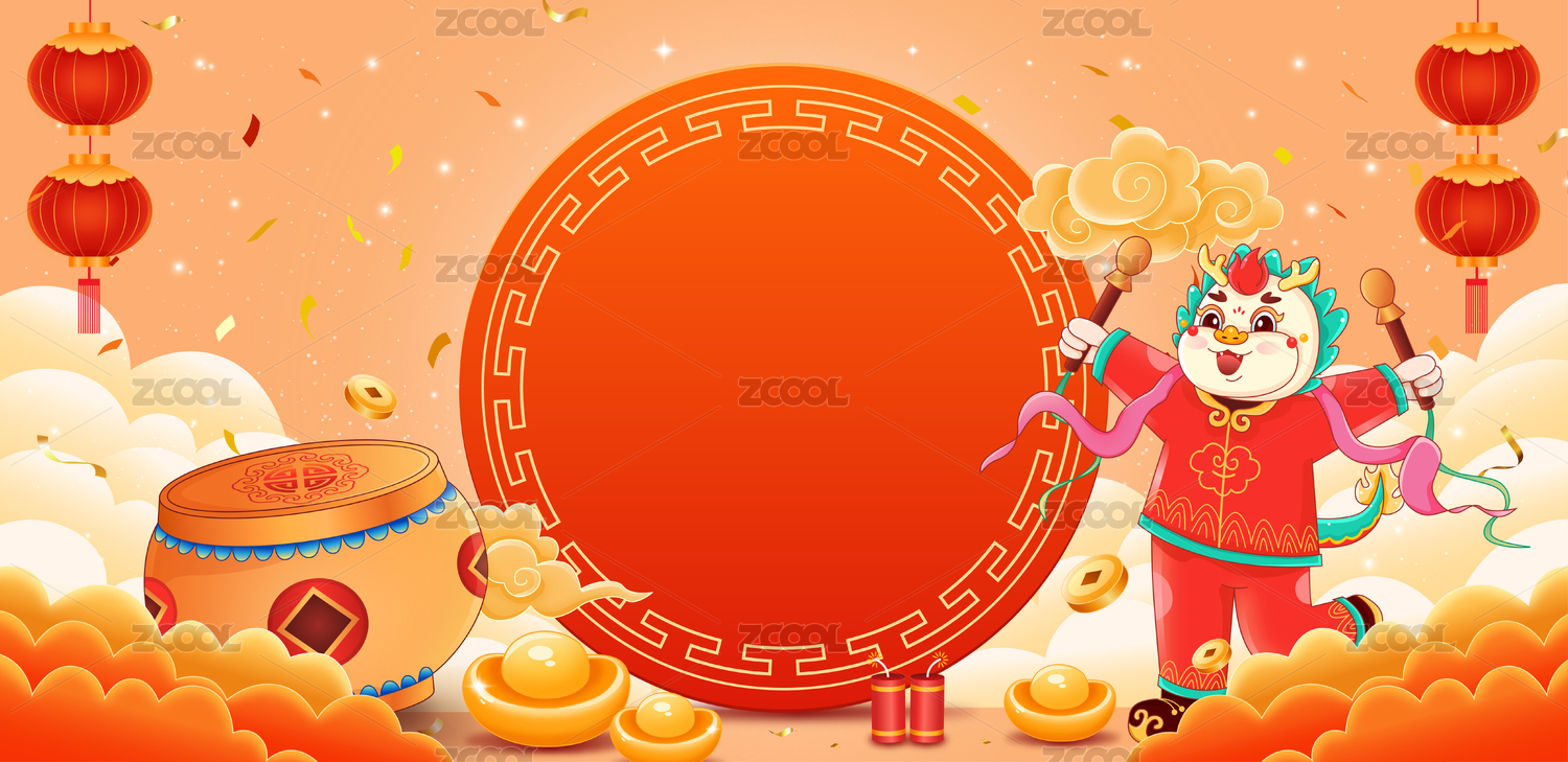 国潮新年龙年一只龙打鼓和灯笼元宝等背景
