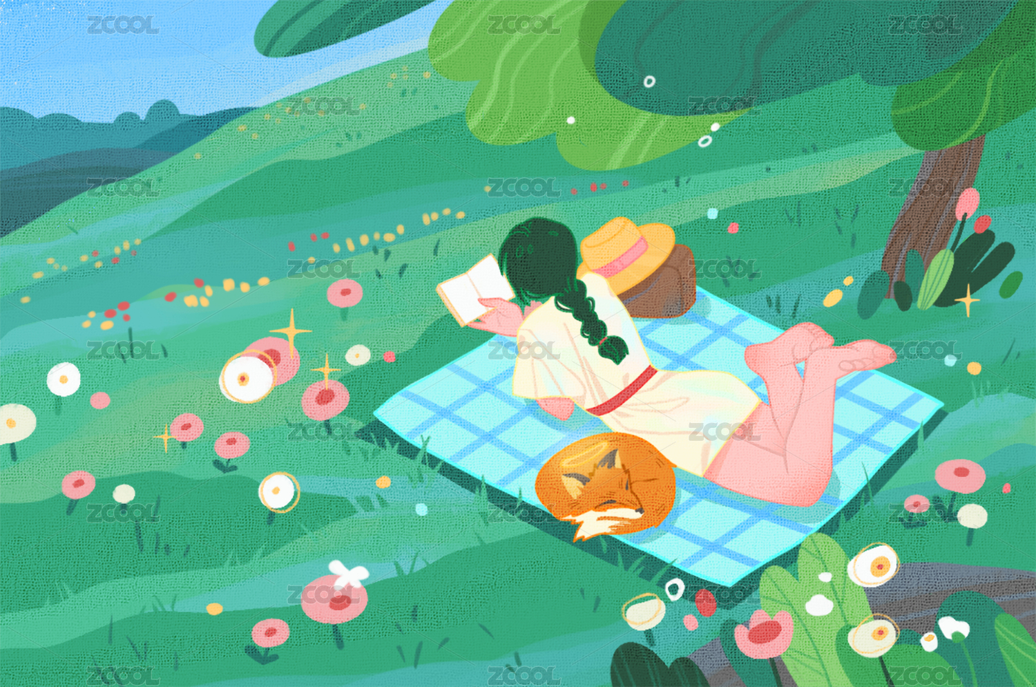 野餐春分立春女孩狐狸植物公园树叶子花卉
