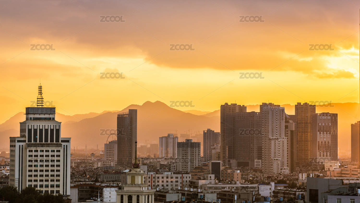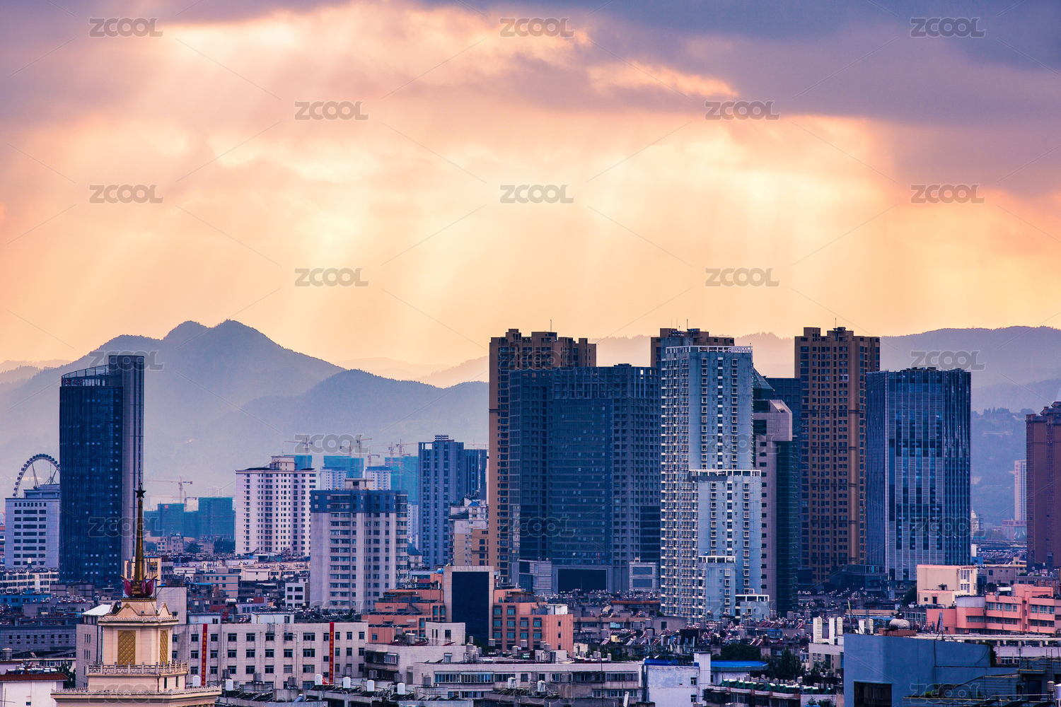 中国云南省昆明市城区日出时分的建筑风光