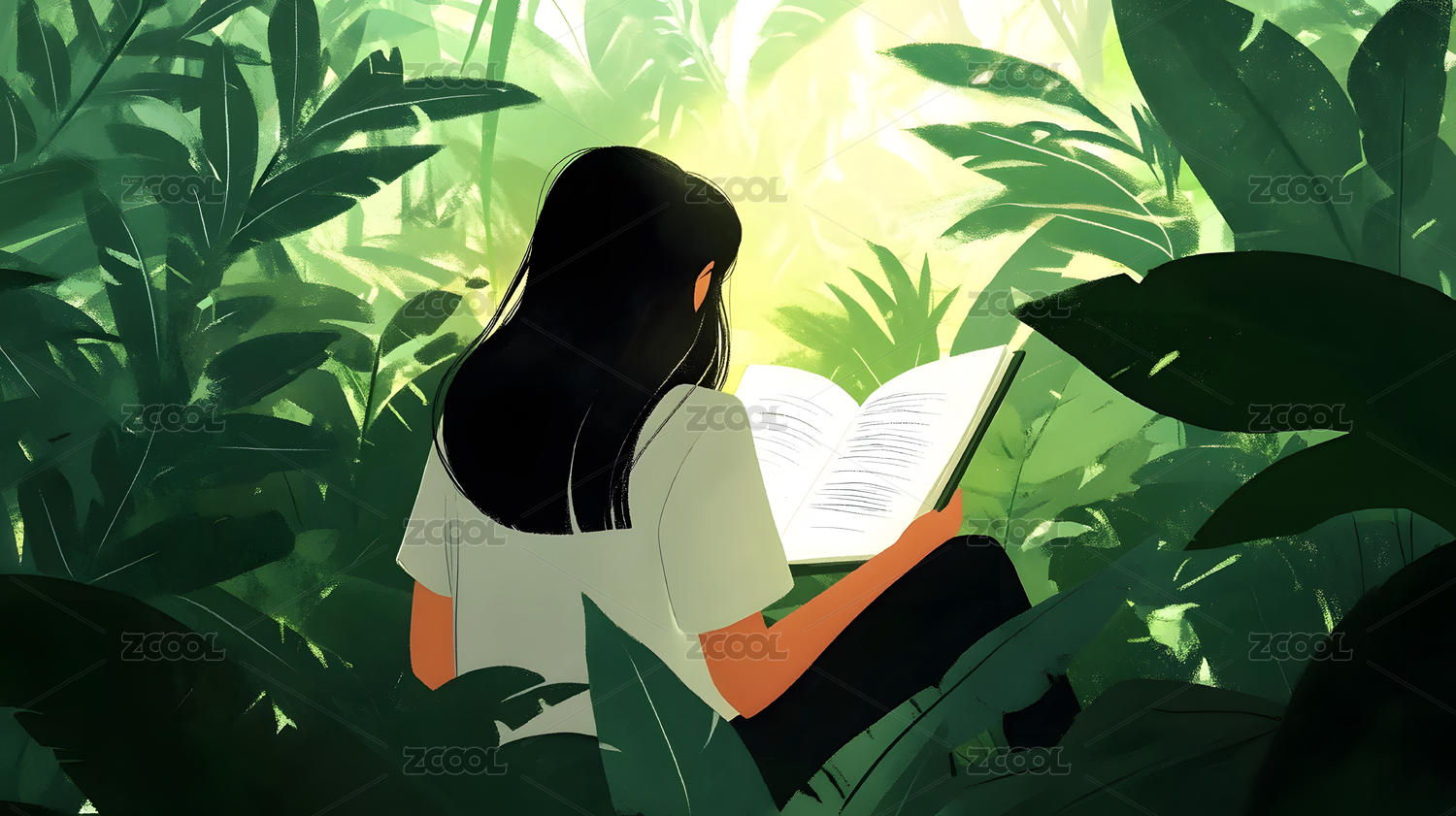 女生在森林中看书手绘插画