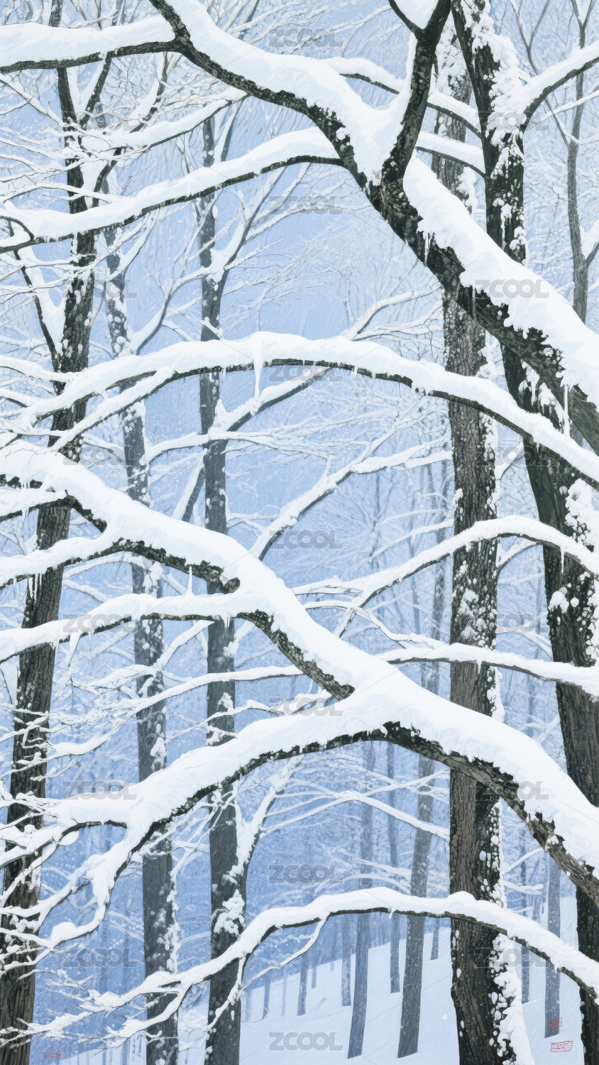 木桥下雪落雪积雪树枝树木唯美插画