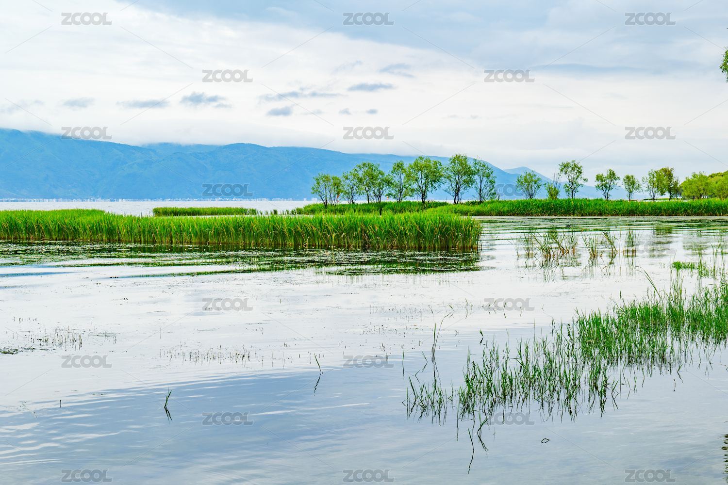 中国,云南,大理,洱海,秋天,白昼,湿地,草地,水草,树