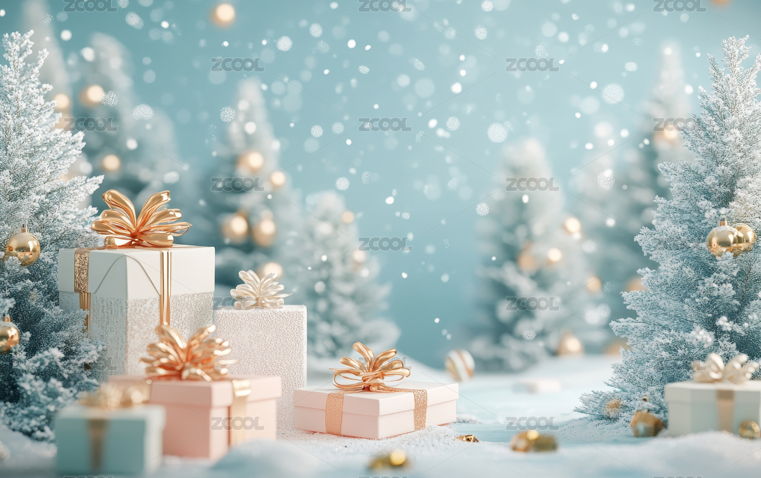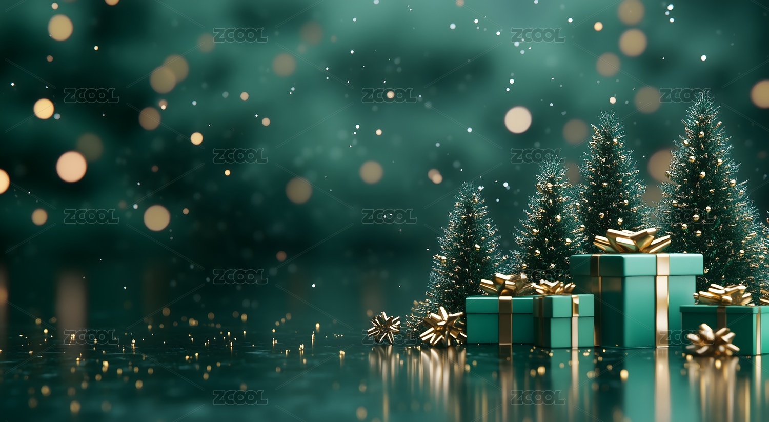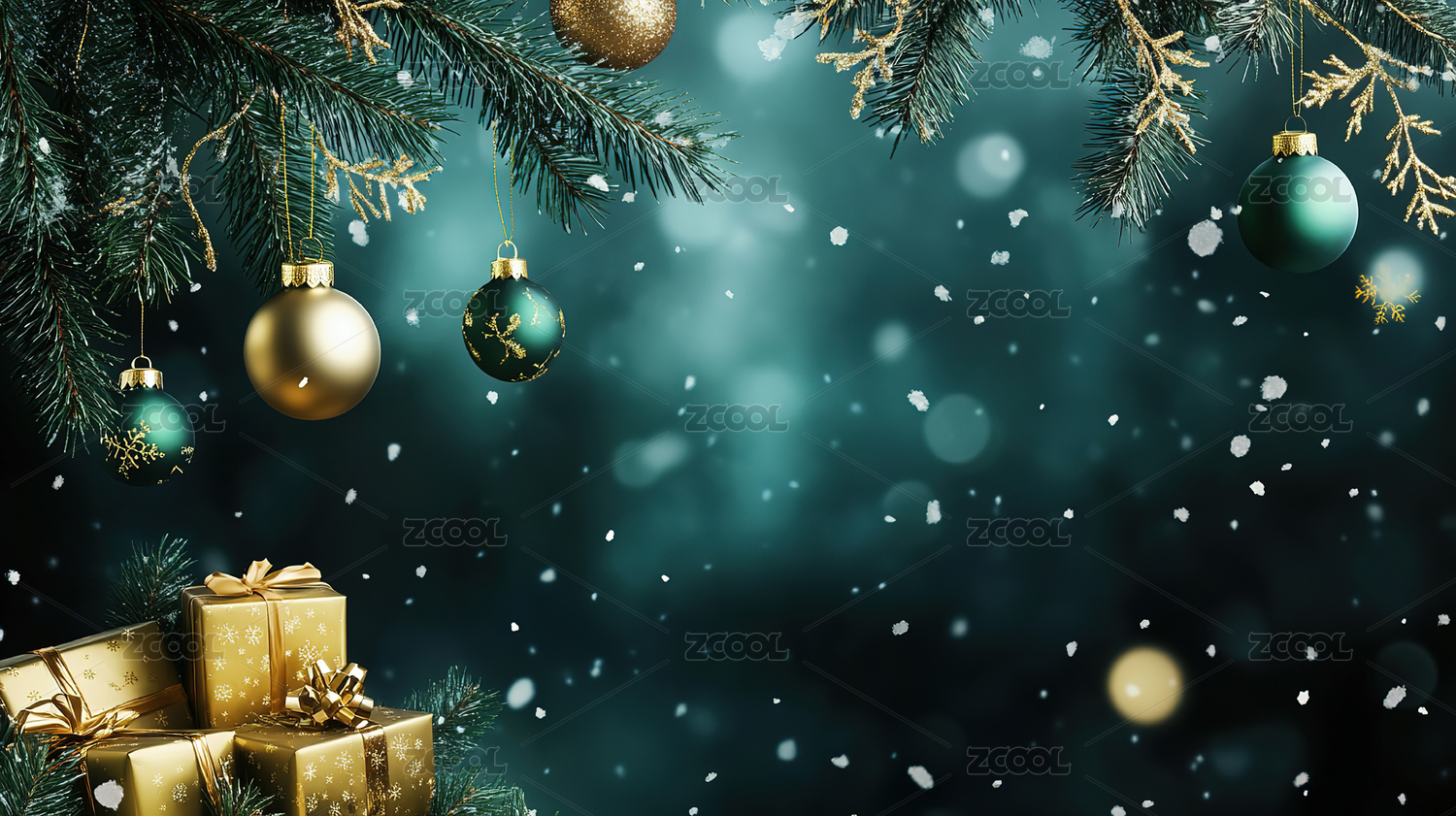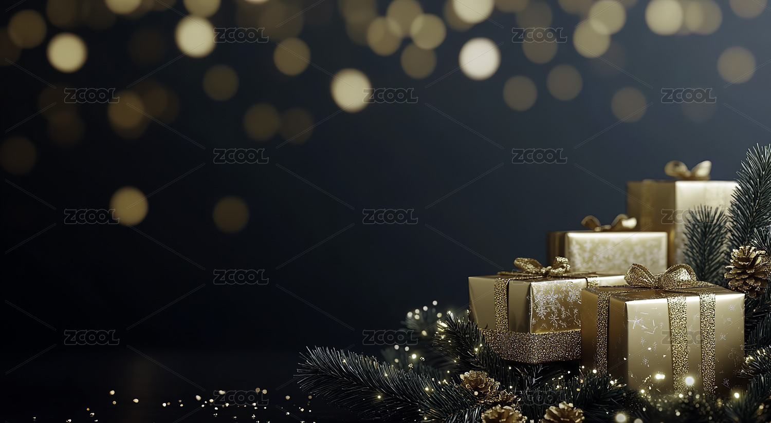 圣诞,礼物,盒子,蝴蝶结,金色,绿色,松枝,雪花,光斑,圣诞节