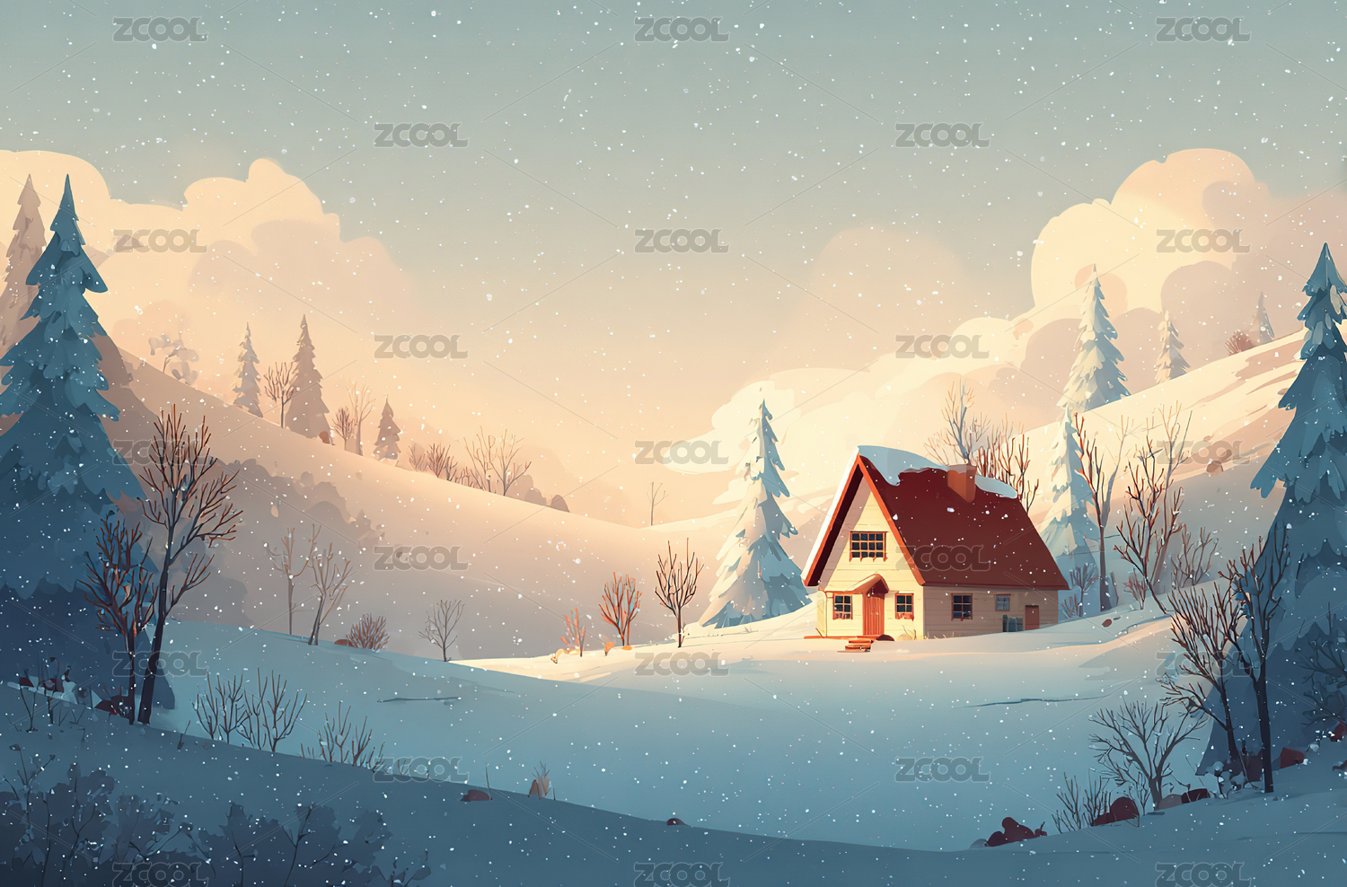 冬日童话风暖色调雪地小屋插画
