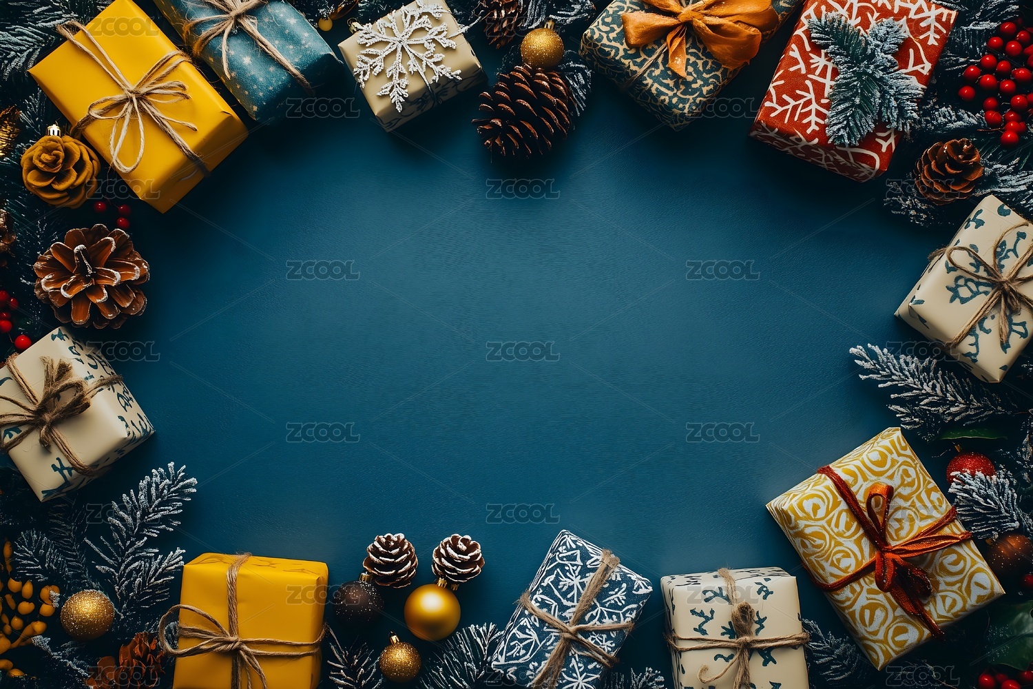 深蓝色圣诞节礼物和装饰品背景