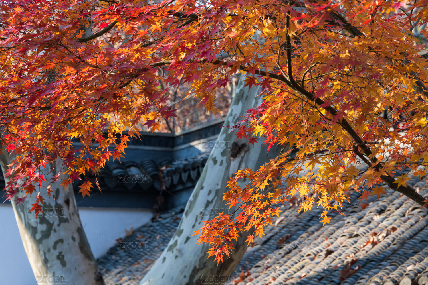 中式屋顶和五彩斑斓的枫叶