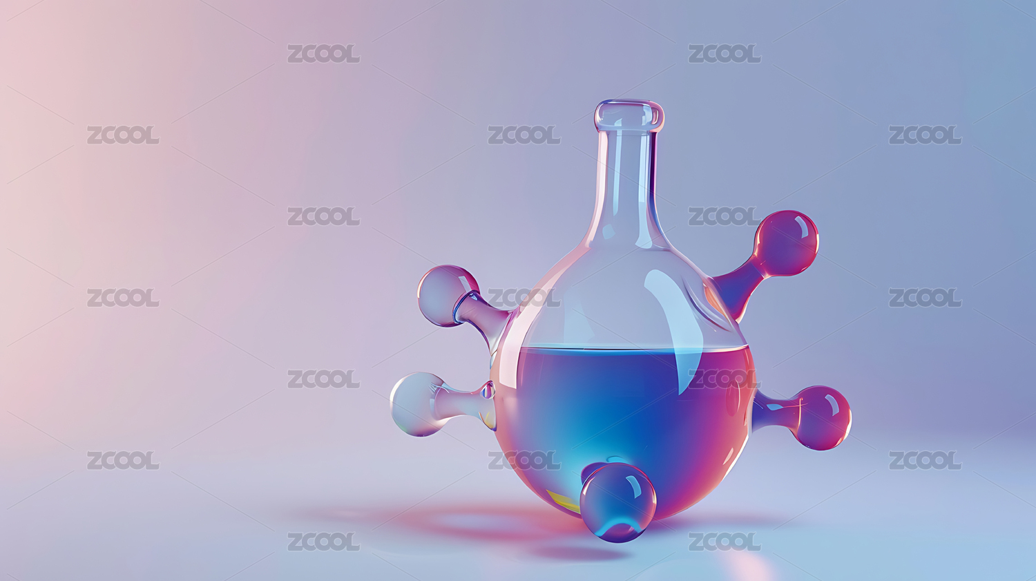 透明玻璃烧瓶在蓝色水晶玻璃快上