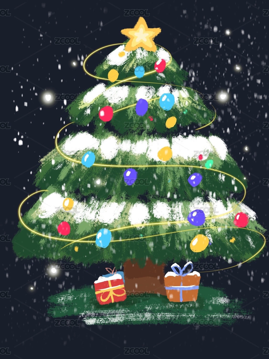 手绘圣诞节圣诞树节日扁平风格商业插画