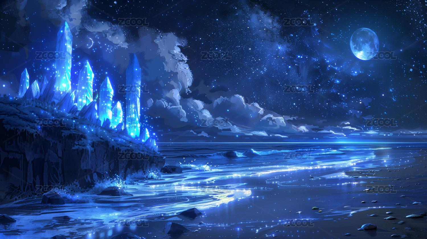 大海沙滩月亮夜晚晶莹剔透荧光梦幻唯美创意