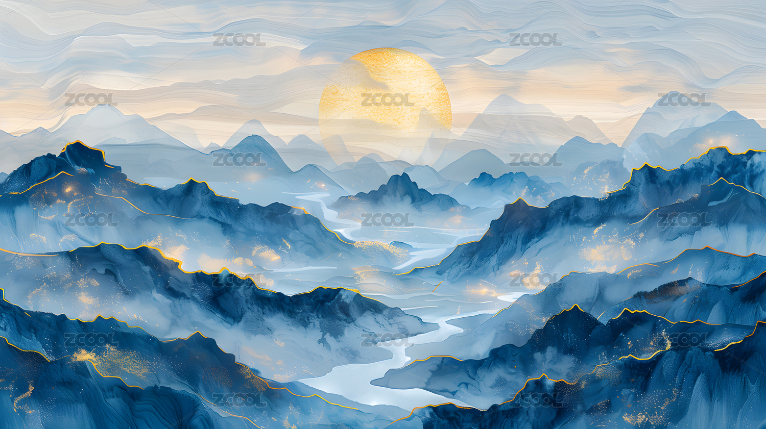 抽象蓝色意境山水装饰画中国风写意山水背景