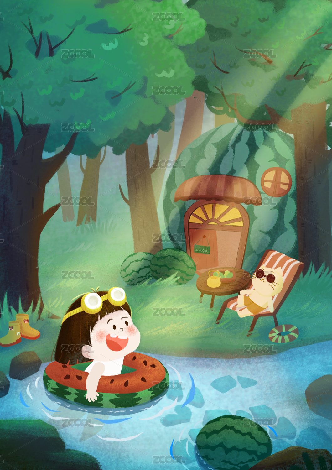 森林大树西瓜屋河边女孩游泳猫晒太阳