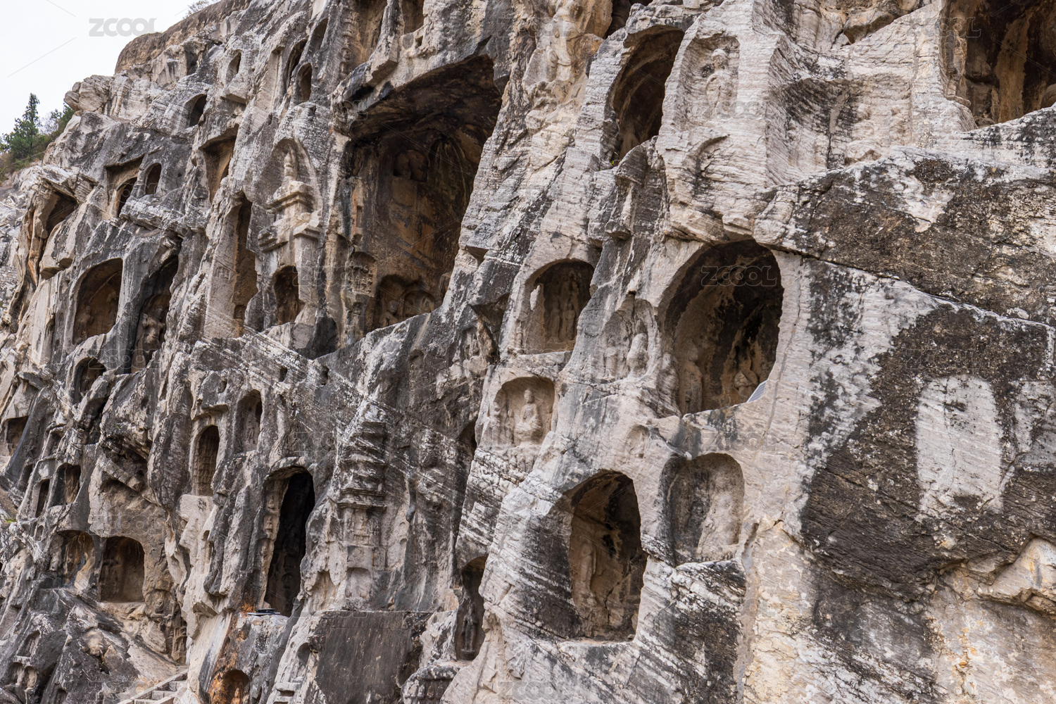 中国河南省洛阳市龙门石窟景区岩壁上石窟群
