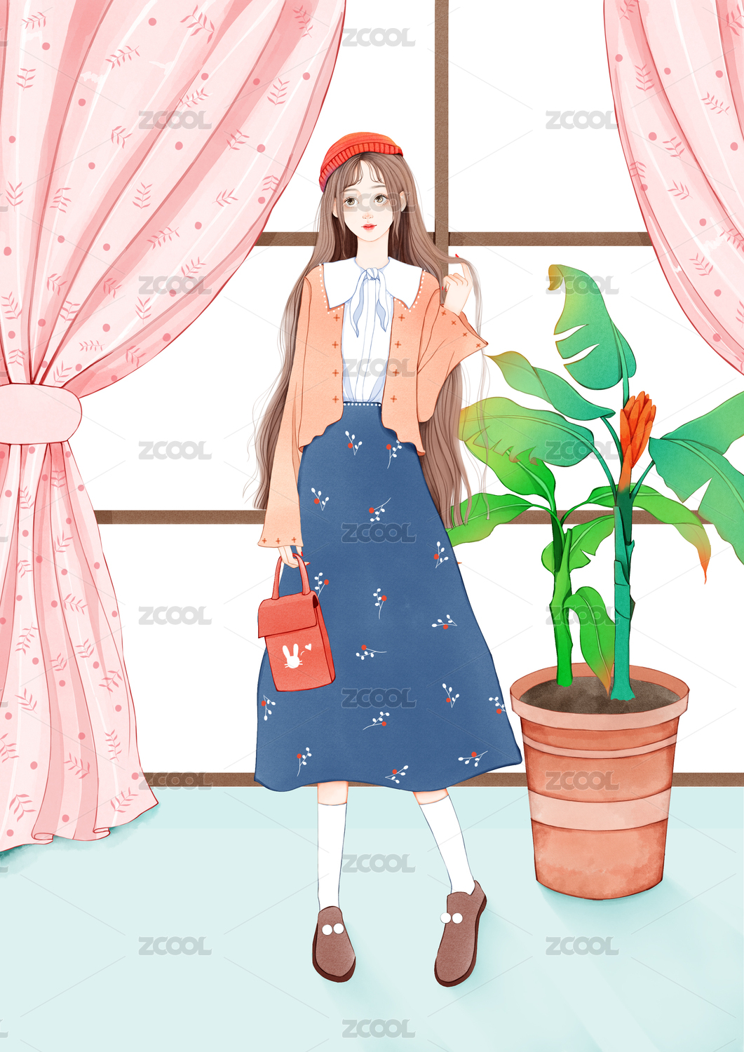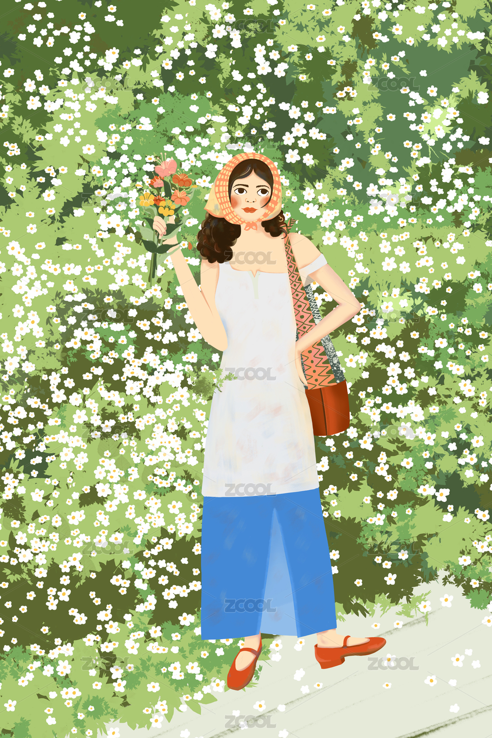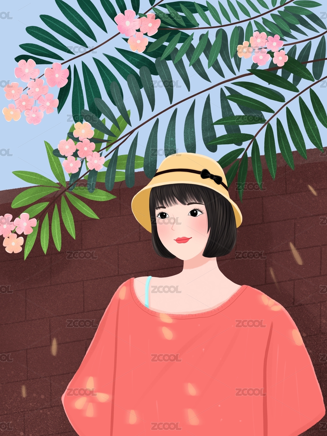 红砖围墙花树下可爱甜美青春清新秀气戴帽女