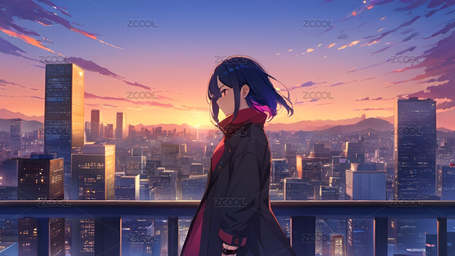 窗边少女眺望城市夕阳