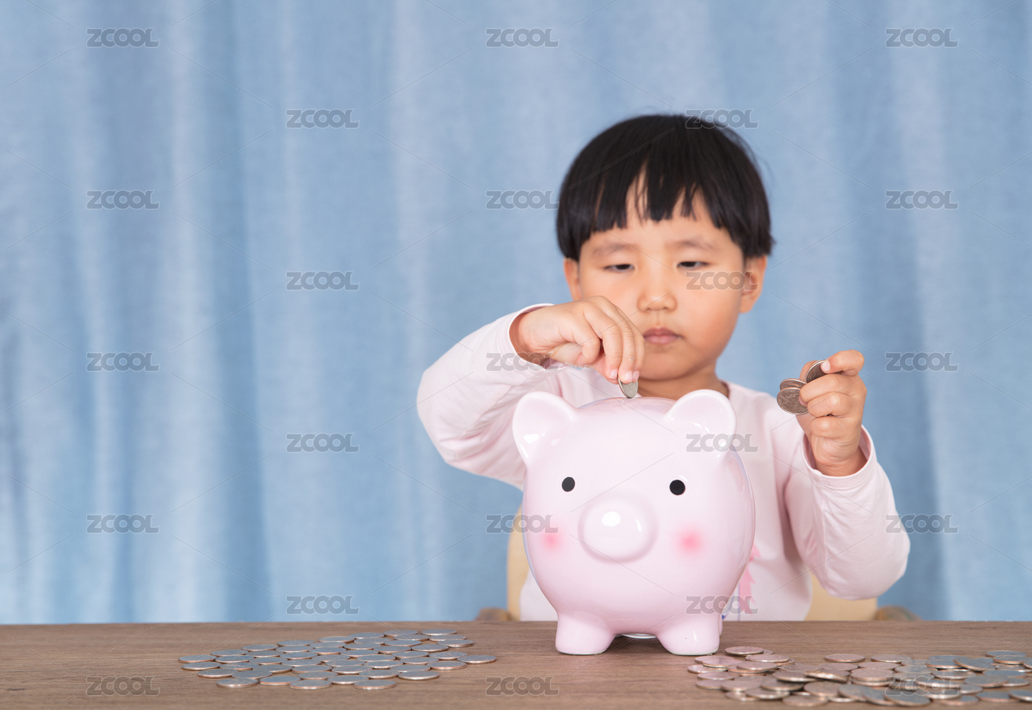 黄皮肤中国小女孩把自己的零花钱装进小猪存钱罐里