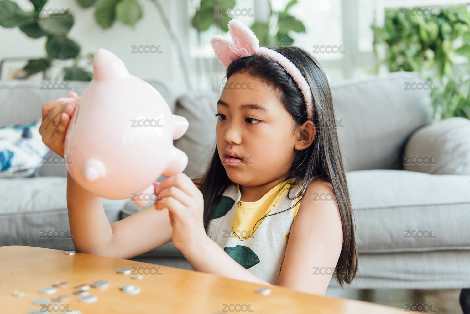 中国小女孩手捧存钱罐看着桌子上的零用钱