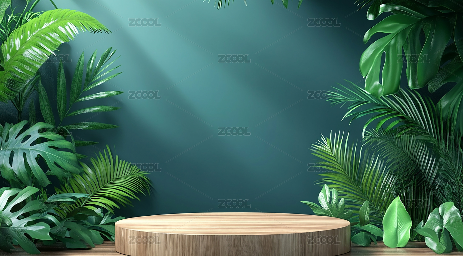 绿色植物与木质产品展台背景